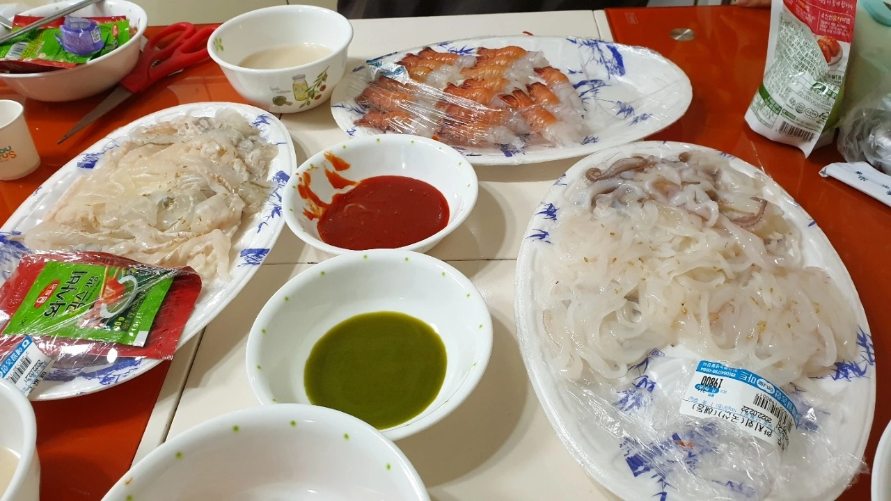 숙소에 도착하자마자 나는 소독 스프레이와 의류소독제를 여기저기 마구 뿌렸다. 그리고 온 가족 모두 손을 깨끗이 다 씻고 드디어 저녁을 먹기 시작했다. 아이들은 닭강정, 샌드위치, 햄버거를, 남편과 나는 딱새우와 회를 맥주와 함께 먹었다. 캬, 바로 이맛이지. 딱새우가 입안에서 살살 녹았고 회는 정말 쫄깃쫄깃 맛있었다.