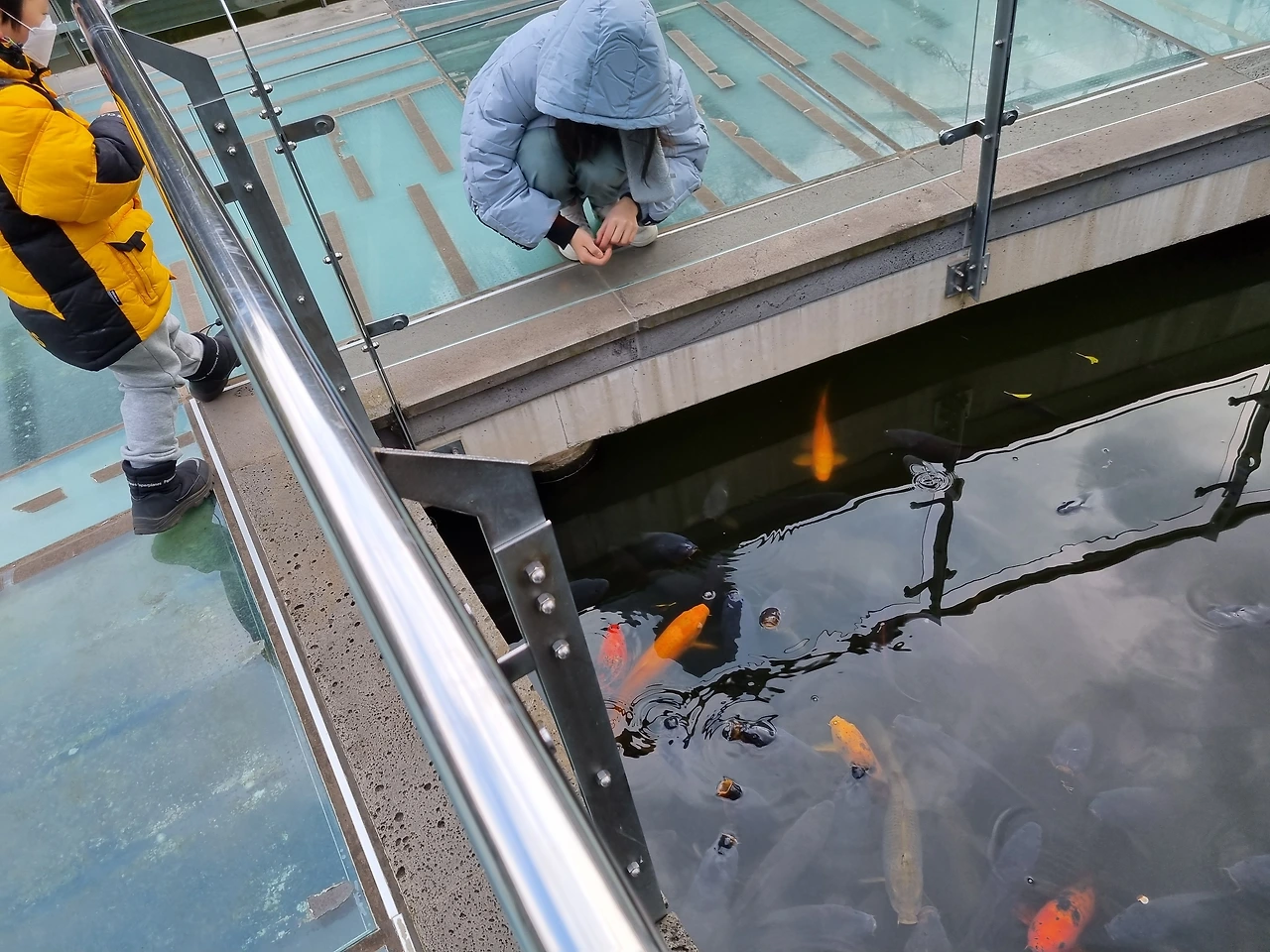주변을 둘러보니 물고기 밥을 판매하는 기계가 보인다. 500원씩 넣어 두 개를 뽑아 아이들에게 하나씩 주었다. 그러자 신나게 물고기 밥을 주는 아이들. 특히 6살 둘째 아들이 제일 신났다. 물고기 밥 2개씩 더 뽑아서 아이들에게 주었더니 30여분을 물고기에게 밥을 주며 신나게 놀았다. 더 비싼 체험관보다 3천 원으로 물고기 밥 주는 체험을 더 재미있어하고 신나 하는 아이들이다. 흐흐.
