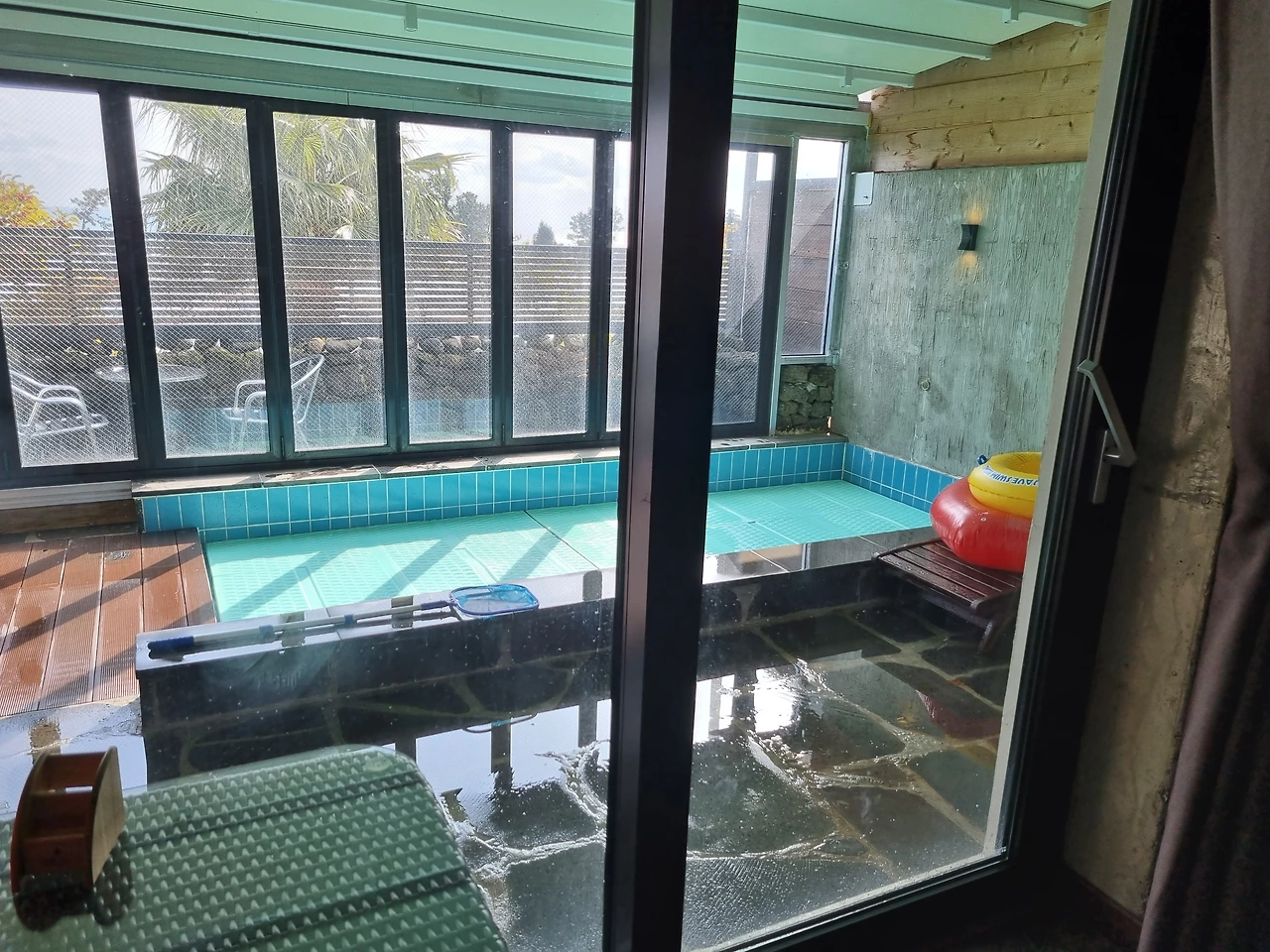 드디어 펜션 입실. 들어가자마자 보이는 커다란 수영장. 뜨거운 물로 된 수영장 물 위로 김이 모락모락 나는 모습과 커다란 튜브까지 있는 것을 보고 아이들은 정말 흥분했다.