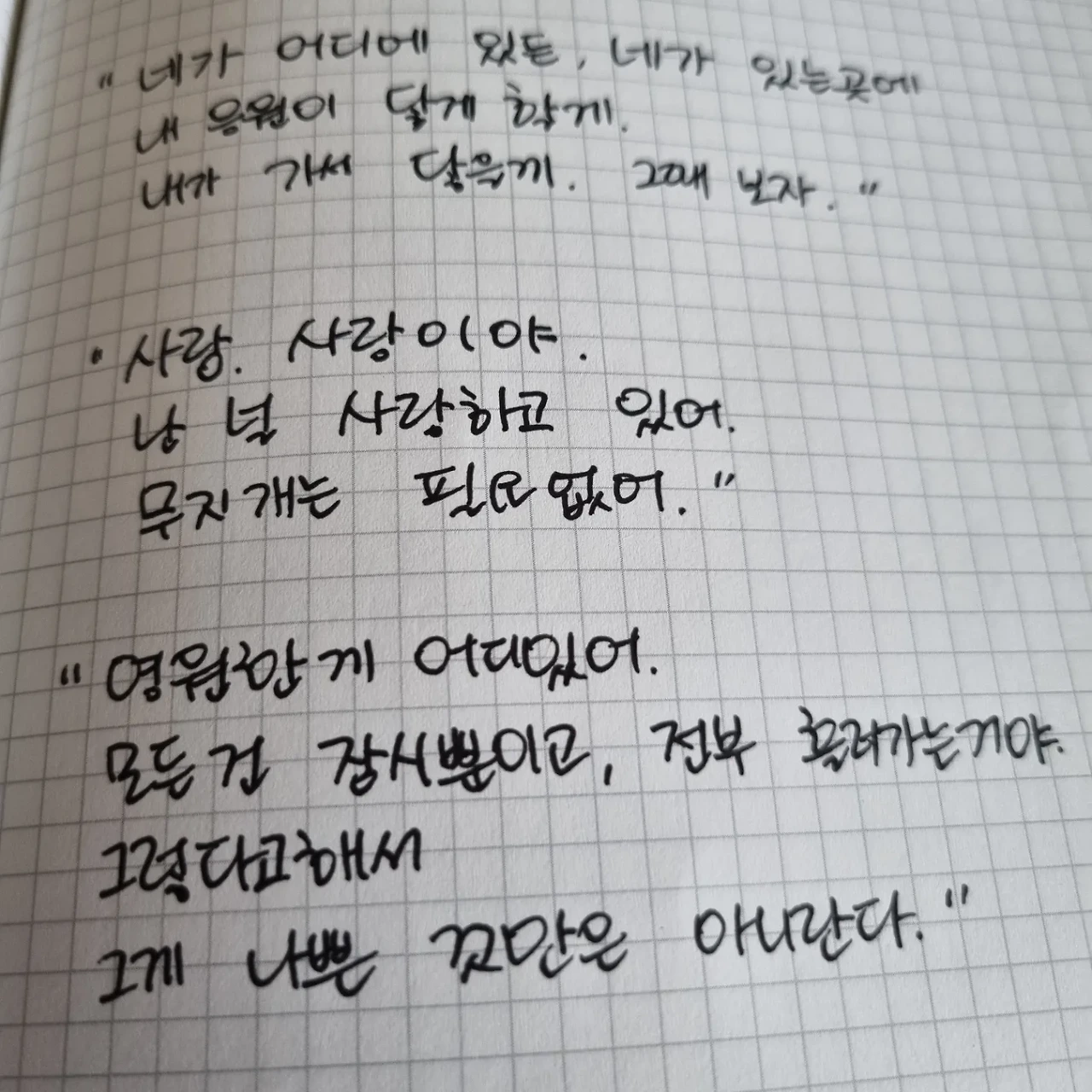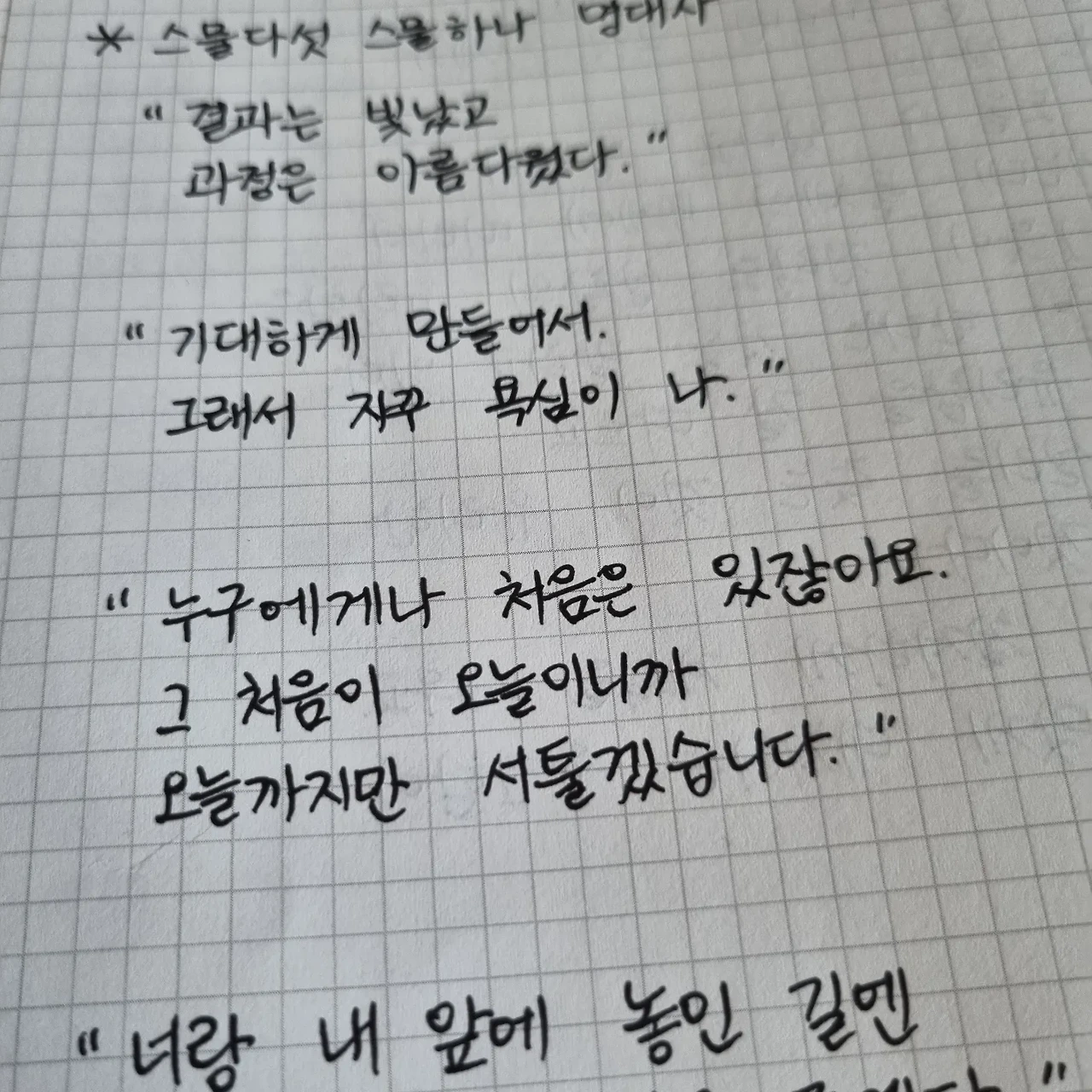 내 글씨체가 여러 종류가 있다는 것도 요 며칠 새에 알게 되었다. 필기를 하다 보니 긴장이 되고 더 이쁘게 잘 쓰려는 마음 때문인지 펜을 쥐는 가운데 손가락이 아프긴 하지만 글씨를 쓰는 게 이렇게 재미가 있었다는 것을 새삼 느끼게 된다.