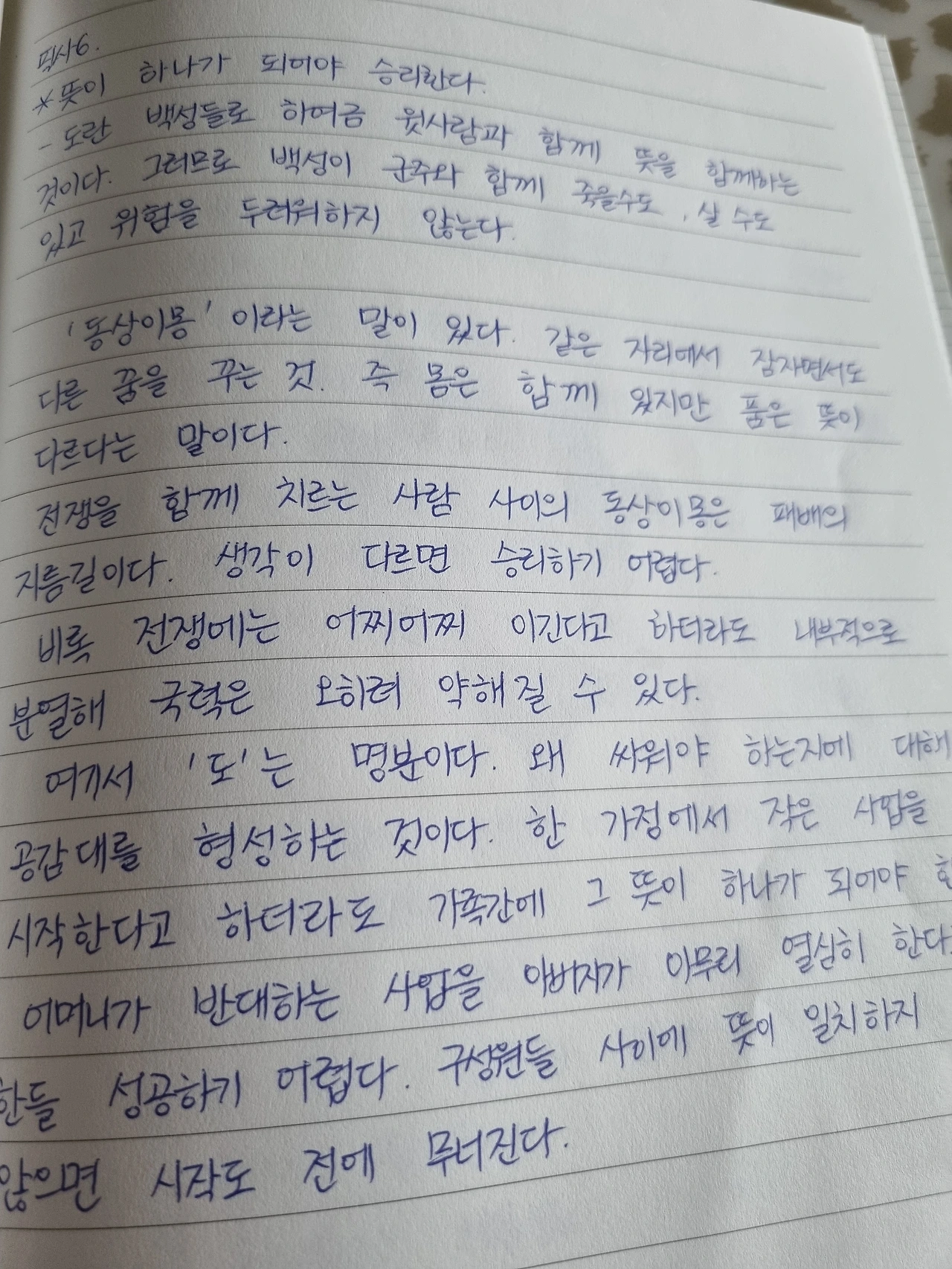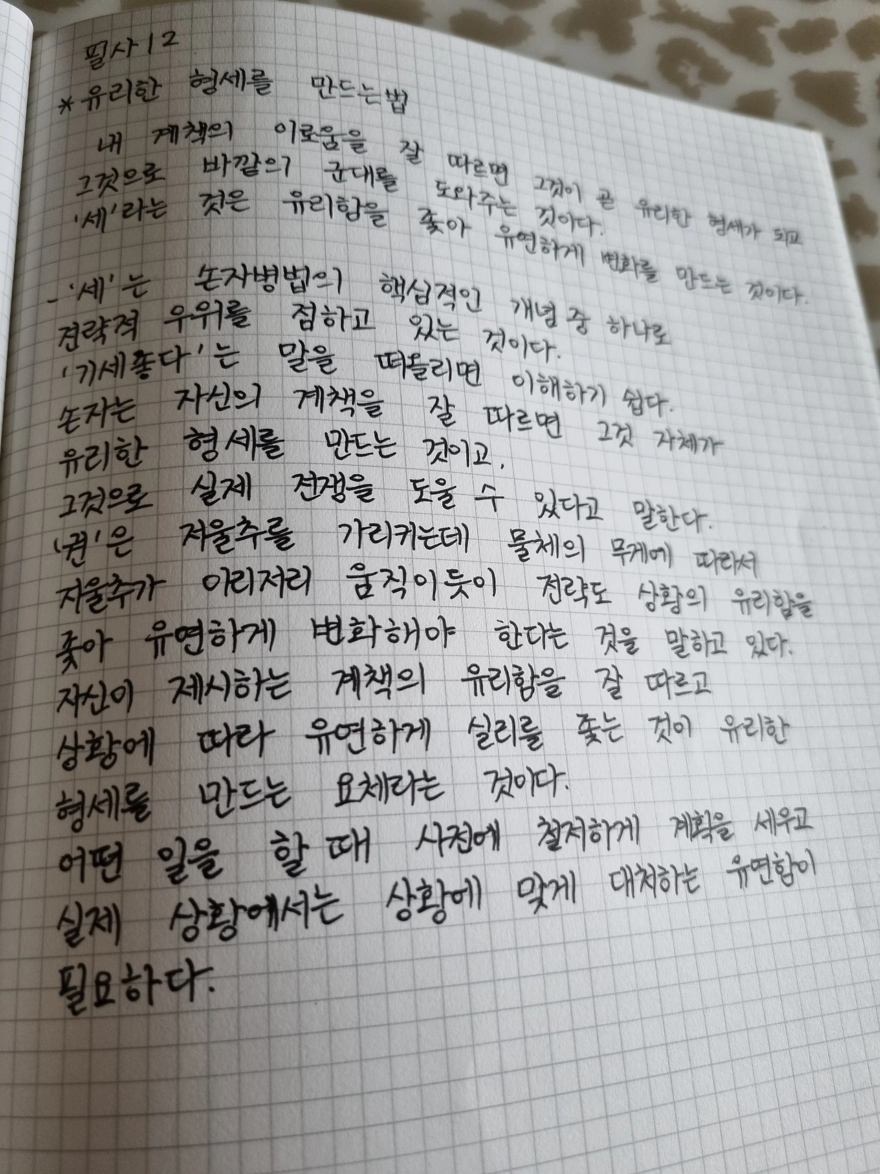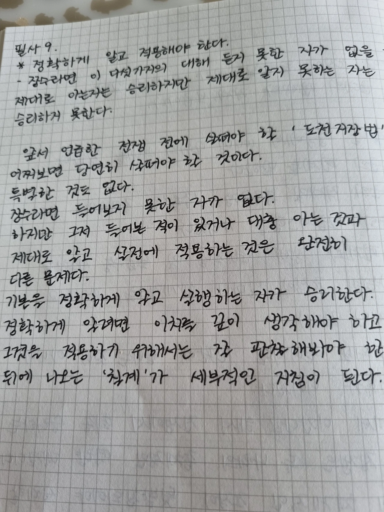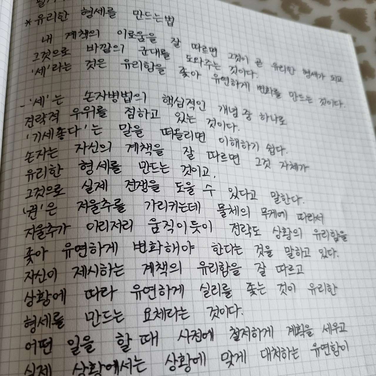 요즘 글쓰기에 도움을 얻기 위해 손자병법을 필사 중이다. 오랜만에 손글씨를 쓰니 글씨가 내 맘처럼 써지질 않았다. 그래도 요 며칠 꾸준히 하다 보니 점점 내 글씨체가 나오고 있다.
