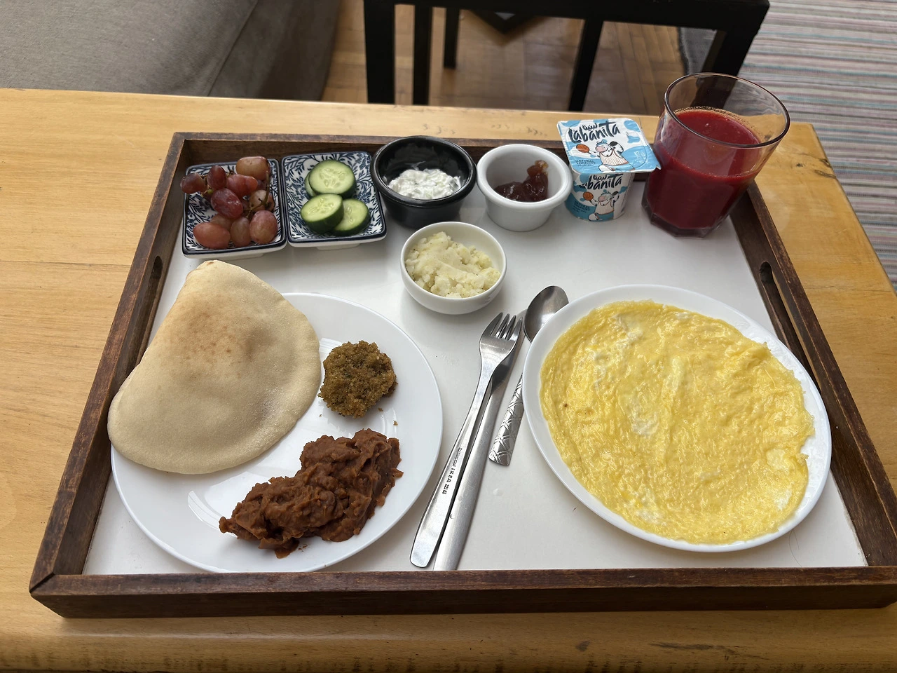 오믈렛과 팔라펠이 고소하게 맛있었고, 딸기주스가 특히 정말 달고 맛있어서 바로 친구에게 내려오라고 연락하여
