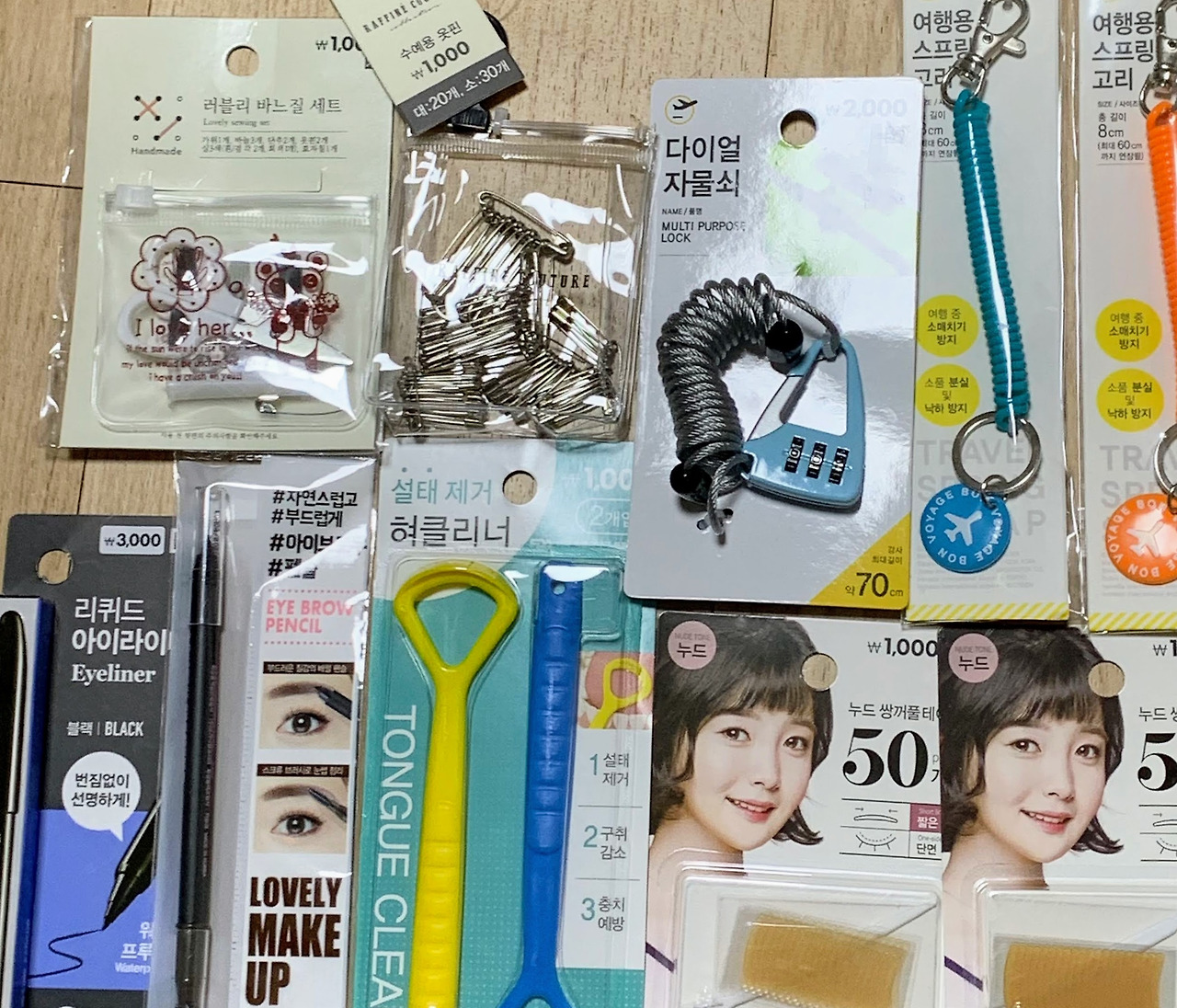 자물쇠, 바느질 세트, 옷핀, 스프링 고리 등 이것저것 담다 보니 어느새 다이소에서 만수르 놀이를 하고 있는 나. 주섬주섬 담다 보니 아무리 다이소라도 견적이 꽤 나왔다. 자세히 보면 이걸 왜..? 할만한 것들도 있다. 아침만 되면 얼굴이 퉁퉁 부어오르는 나에게 필수품인 쌍꺼풀 테이프와 (부어오른 눈두덩이 살에 속쌍꺼풀 마저 파묻혀 사라져 버릴 때가 종종 있다) 혀의 건강을 위한 혀클리너까지. 평소 보부상마냥 짐보따리를 한가득 들고 다니던 습관은 장기 여행자에겐 취약점이겠구나. 하긴 떠도는 여행자라고 하나같이 모두 미니멀하진 않겠지. 간혹 나같은 맥시멀한 여행자도 있을거야.