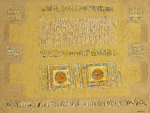이성자 화백의 작품 시기를 크게 네 시기로 나누는데 크게 ‘여성과 대지’, ‘도시, 음과 양’, ‘지구 반대편으로 가는 길’, ‘우주시대’로 구분합니다. 나는 여자이고, 여자는 어머니이고, 어머니는 대지이다라고 이야기하는 여성과 대지 시기에 그린 1961년작 [함께 있으면]은 본격적으로 작업에 몰두하기 시작한 시기에 그린 작품입니다. 화면을 반복적으로 덧칠하고 긁어내는 방법으로 그려낸 작품은 집중력과 반복적인 노동력이 집중된 것으로, 아이들에게 밥을 떠 먹이는 어머니의 행동을 상징합니다. 이 시기의 작업은 이성자 화백의 자식들을 향한 그리움과 또 고통을 치유하는 과정으로 해석합니다.