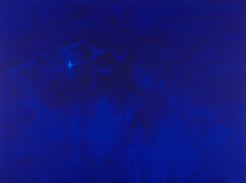 한지석 작가의 [깊은 주의] 는 작품 제목처럼 캔버스에 깊은 주의를 기울여보길 권합니다. 강렬한 마린 블루 컬러가 캔버스를 뒤덮었는데, 그 위로 산, 나무, 하늘 같은 형태가 희미하게 윤곽을 드러내고 있습니다. 얼마나 높은 산인지 어떤 계절인지 도무지 알수가 없지만 관람객의 깊은 주의를 끌어내는 것은 분명합니다. 그리고 산 등성이에서 빛나는 무엇인가는 과연 무엇을 표현하려고 한 것인지, 누군가의 조난 신호일지, 추상적인 표현일지.