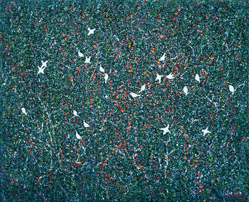 Camellia 연작 또한 큰 캔버스에 동백꽃이 만개한 풍경이 담겨있는데요. 가까이서 또 멀리서 관조하듯이 작품을 보면 색다른 감흥을 느낄 수가 있습니다. 동백꽃 주위로 하얀 동박새들의 모습도 인상적이구요. 강 화백은 동백을 소재로 삼아 그리는 이유에 대해 다음과 같이 설명합니다. “동백은 엄동설한에서도 꿋꿋이 자신의 모습을 움티워 붉은 꽃으로 피어나는 강인함을 지니고 있습니다. 이는 한국인의 정신에 비유할 수 있지요. 또한 동백은 자신의 아름다움이 절정일 때 미련 없이 자신을 내려놓을 줄 아는 아름다움도 지니고 있습니다“