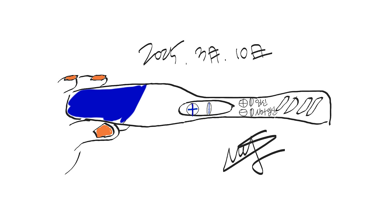 그런데 두 눈을 믿을 수 없는 일이 생겼다. 눈도 제대로 다 뜨지 못한 채 얼른 쓰고 버릴 요량으로 해 본 임신 테스트기에는 아주 선명한 임신 선이 나타나 있었다.