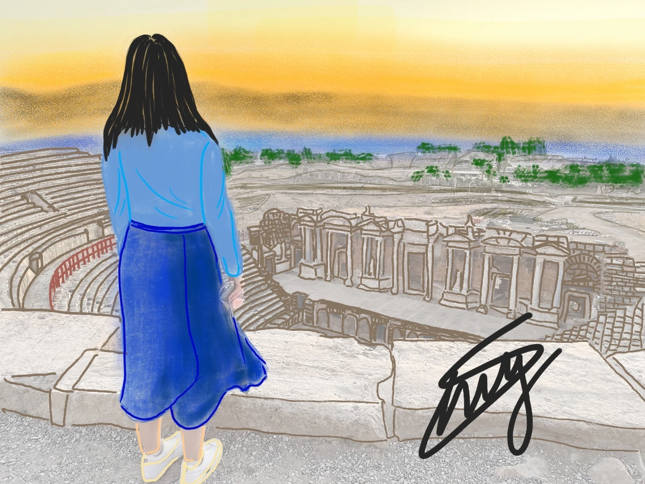 헉헉거리며 올라간 원형 극장의 꼭대기에서 은은하게 보이는 빛나는 지중해와 웅장한 온천 도시를 한눈에 담을 수 있었다. 힘드니 너 혼자 가라며 손을 내저었지만 나에게 끌려서 올라온 엄마도, 이 광경을 보고는 따라오기 잘했다며 연신 감탄했다.