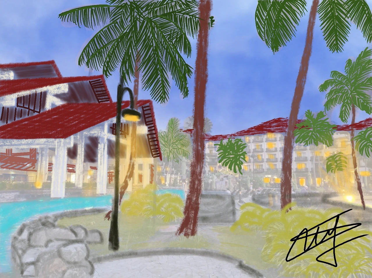 눈을 뜨니 커튼 밖 작은 발코니 앞에 천국이 펼쳐져 있었다. 드높은 야자수 나무, 그 아래 청량한 수영장, 그리고 그 너머로 보이는 바다까지. 마치 제일 좋아하는 간식을 기다리는 어린이가 된 것 같은 마음으로 신나서 폴짝거리며 바깥으로 뛰어나갔다. 이곳은 낮도 밤도 참 예쁘구나!