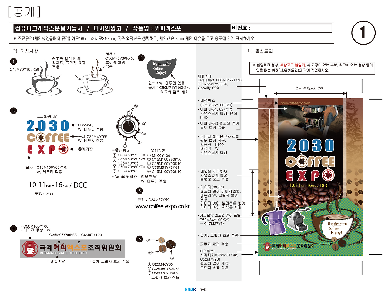 지난해 6월, 필기는 쉽게 통과했다. 문제은행 방식이라 전체 내용을 훑은 후 기출문제를 중심으로 공부했더니 어렵지 않은 느낌이었다. 문제는 실기 시험. 문제지에 제시된 포스터와 아주 비슷하게 만들어야 한다. 지시사항에 따라 일러스트로 그림을 그리고, 포토샵으로 효과를 준 후 인디자인에서 파일을 불러와 사이즈를 줄이고 출력해야 한다.