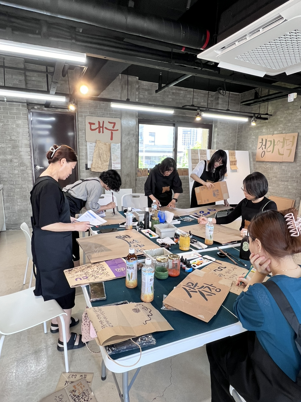 다음으로는 구성한 책의 내용을 내지의 크기에 따라 연습종이에 연습하는 시간을 가졌다. 그동안 팀 멤버와 시민 멤버들이 모아 둔 박스나 종이백, 마트 배송봉투 등을 잘라 작품을 하기 위해 글씨체와 크기를 조절해 보았다. 히르꼬님은 지난번 수업에 참여하지 못한 분들에게 1:1 맞춤식 과외를 속도감 있게 진행해 주셔서 모든 멤버들이 즐겁게 참여할 수 있었다.