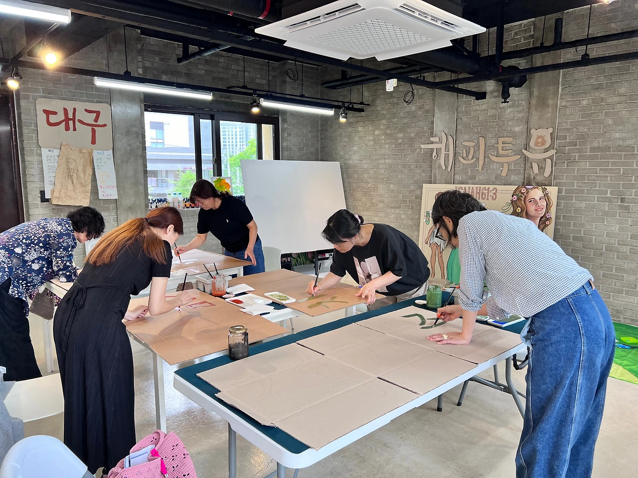 미리 크게 잘라 둔 박스 위에 내가 고른 핫플을 써 보는 활동이다. 첫 시간에 만들어 둔 천연물감을 활용하여 색을 칠했다. 그림 전문가 요고코드님께서 맡아 진행해 주셨다. 이번에 만든 천연물감은 수채용이므로 물감과 물을 섞어 적당한 농도를 만들어 보았다. 천연물감을 만든 베이스는 똑같지만 색을 내기 위해 첨가한 안료의 성질에 따라 박스 위에서 색상이 잘 나오지 않거나 묽거나 하는 특성을 보였다. 요고코드님은 이에 맞게 덧칠하거나 다른 색 물감을 첨가하여 더 잘 보일 수 있도록 이끌어주셨다. 완성된 작품은 랩실 벽 곳곳에 부착했다.