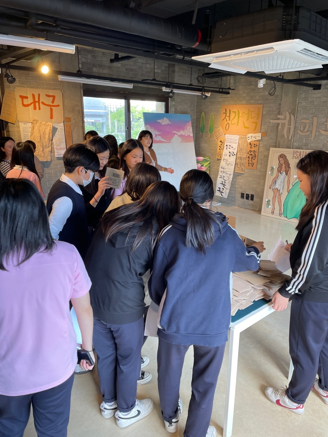 11시에서 12시 사이에 영남대 회화과 2학년, 3학년 학생들이 교수님과 함께 전시회에 참여하러 20명 이상이 랩실로 들어왔다. 교수님과 학생들은 수창청춘맨션 레지던시에 관한 몇 가지 질문을 하셨다. 갑작스러웠지만 정신을 차리고 하나씩 답변해 드렸다.