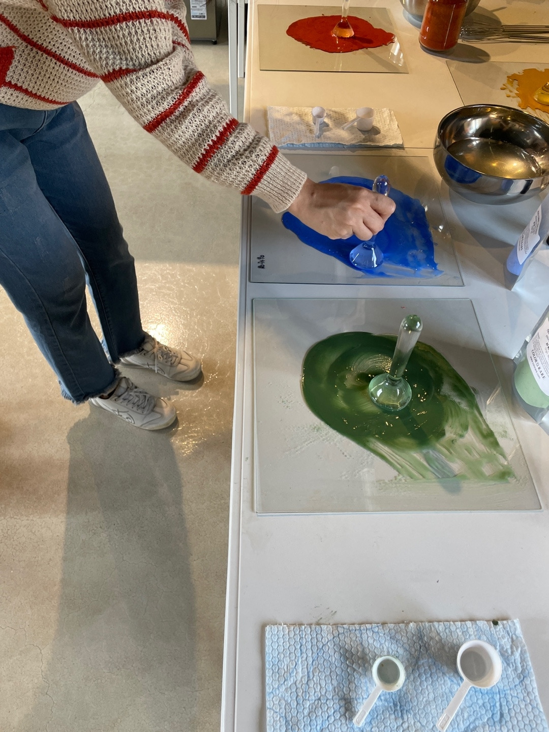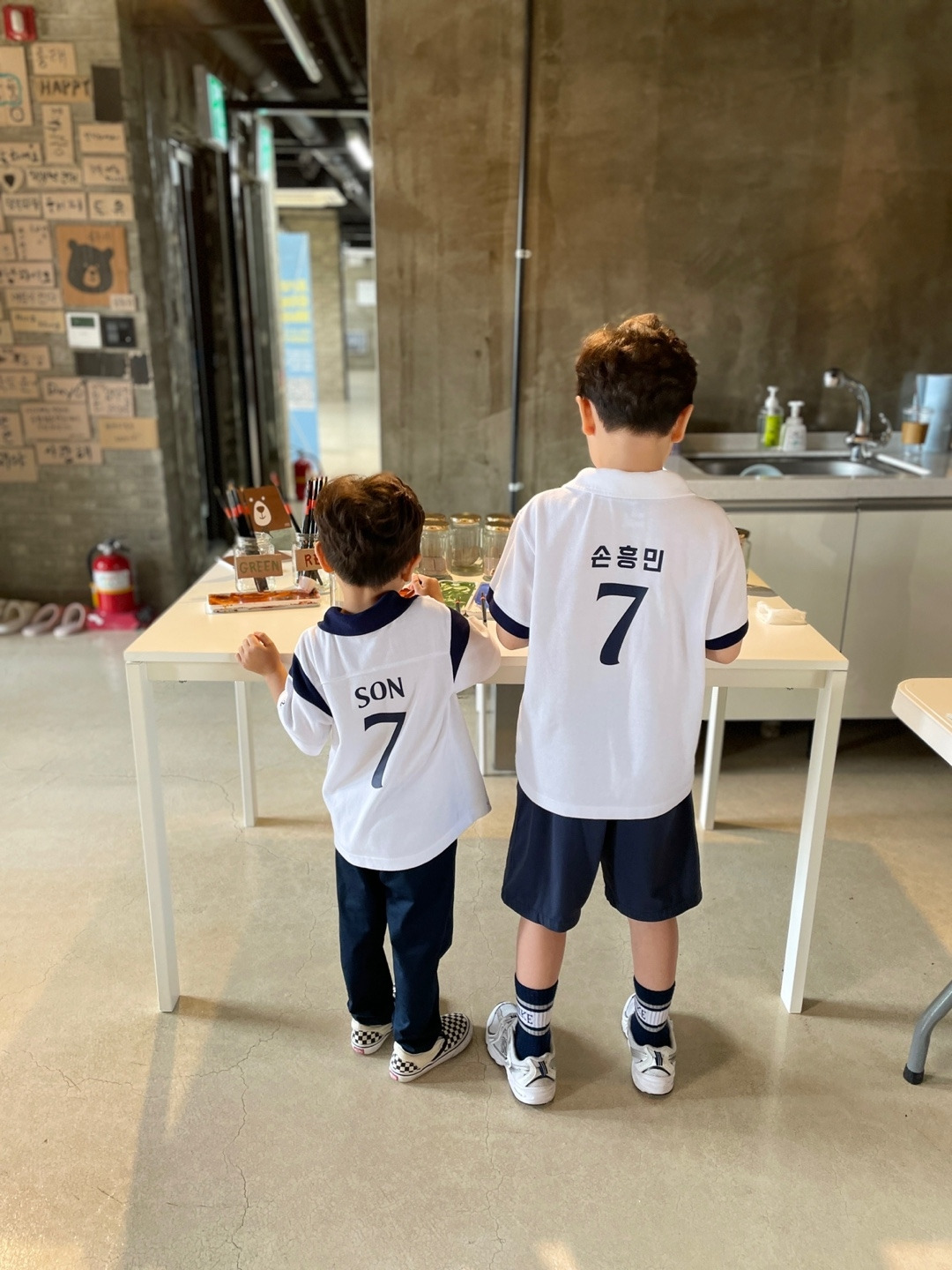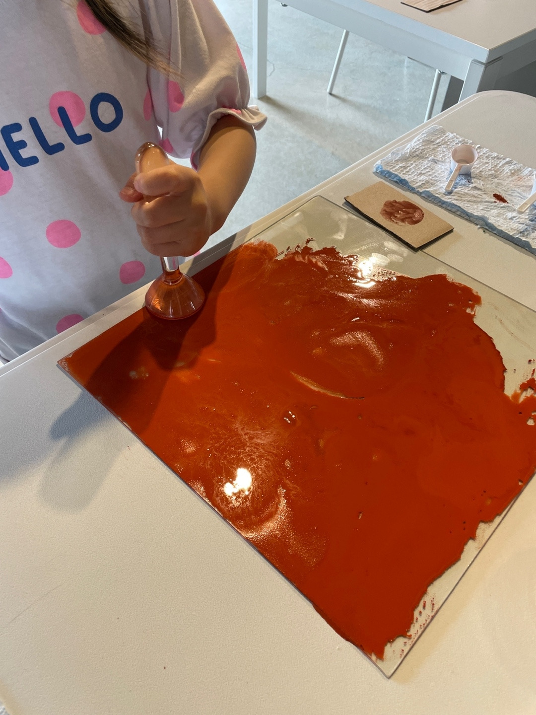친환경 물감 부스에 적극적으로 참여해준 어린이들. 유리판 위에 뮬러로 물감 섞기와 붓과 친환경 물감으로 그리기를 재밌어했다.