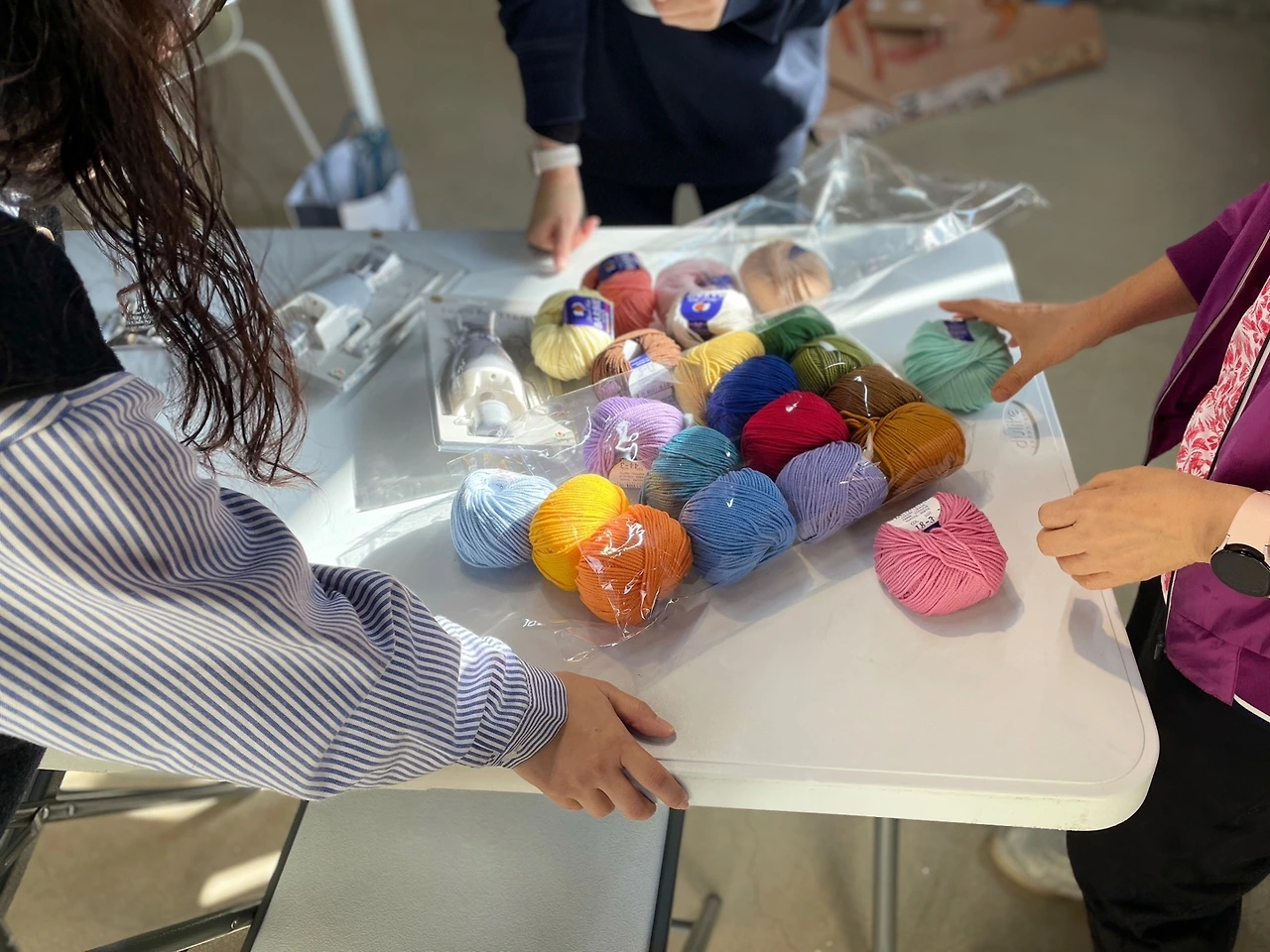 코바늘 뜨기 경력을 가지고 계신 분들은 모두 작품이 완성되었기 때문에 니트레터링을 해보자고 말씀드리니 무척 즐거워하셨다. 안 그래도 니트레터링이 있는 것은 아는데 어떻게 하는 것인지 많이 궁금했다며 눈을 반짝이셨다. 니트레터링을 시작하기 전 실과 기계를 나눠드리기 위해 준비물이 있는 테이블로 모였다. 맘에 드는 색깔을 두 개씩 고르고 기계를 하나씩 받아 자리로 이동했다.