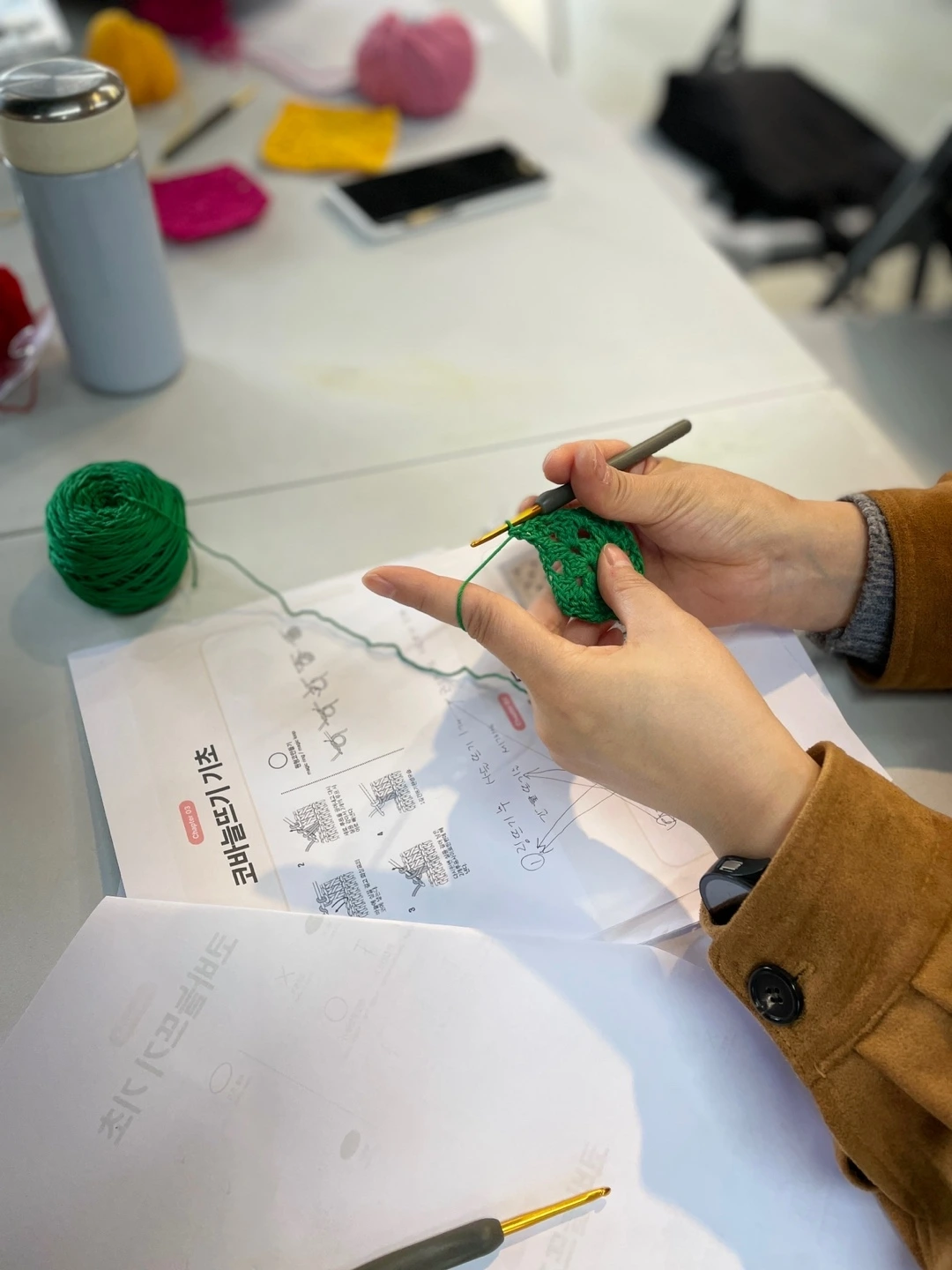 지난주에 코바늘 기초를 배우신 두 분은 코바늘과 실을 대여해 가셔서 집에서 해보시겠다고 했다. 어릴 적에 혼자 코바늘을 가지고 놀아봤던 경험으로 손에 실을 걸고 사슬 뜨기 한 번을 해내는 게 되게 어려웠던 기억이 난다. 그리고 사슬들이 균일하게 나오게 하기 위해 코바늘을 어떻게 잡아야 하는지 아는데도 꽤나 오래 걸렸던 기억이 있기에 흔쾌히 빌려드렸다.