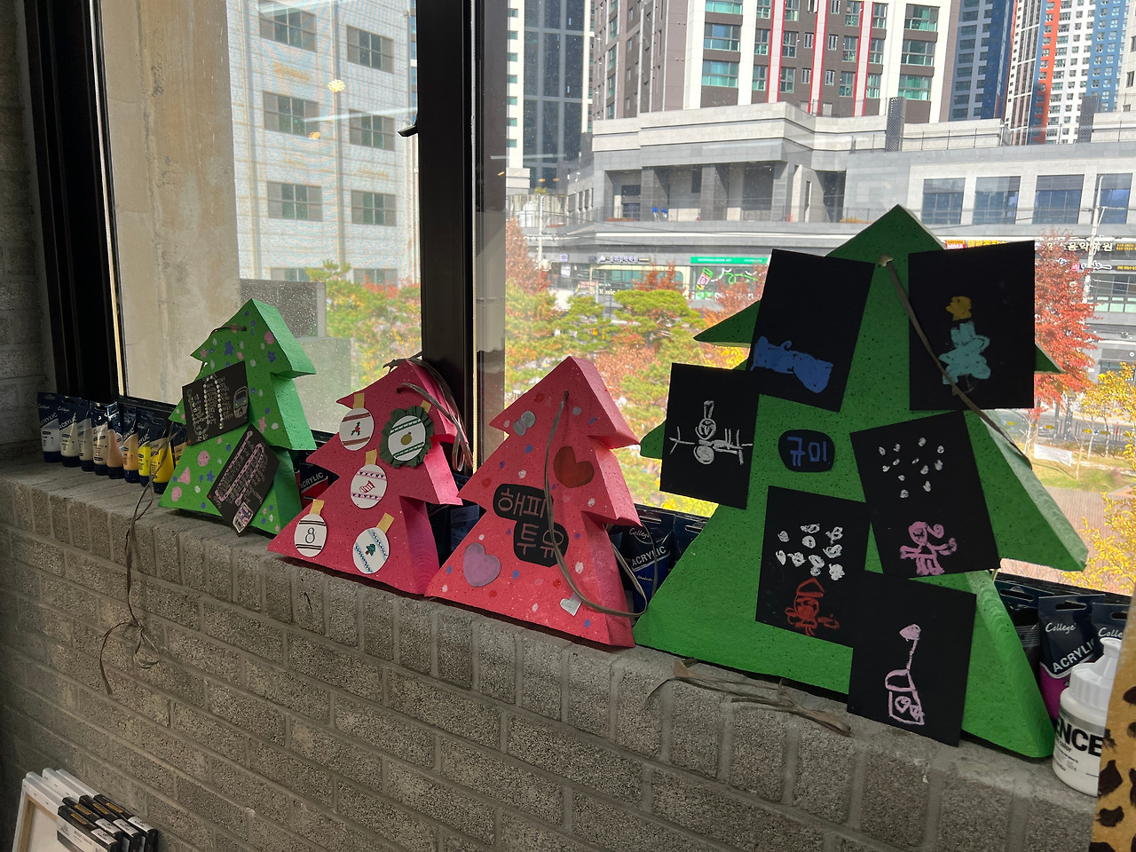 시민멤버들은 완성한 엽서 형식의 오너먼트를 큰 트리에 부착해 주셨다. 다음으로 시민멤버 각자 하나씩 행잉트리를 꾸며 창가에 올려두었다.