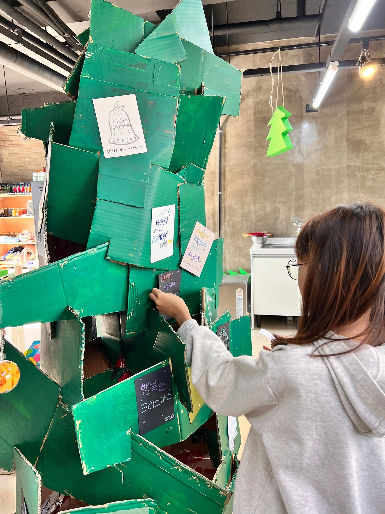 각자의 개성을 담은 행잉트리와 모두 함께 장식한 대형 박스 트리. 시민멤버들이 돌아가신 후 요고코드님과 히르꼬님은 트리들을 함께 배치하며 장식하셨다. 우뚝 솟은 큰 트리 주변에서 빙글빙글 돌며 걸려있는 행잉트리는 랩실 한쪽을 꽉 채워주는 것 같았다.