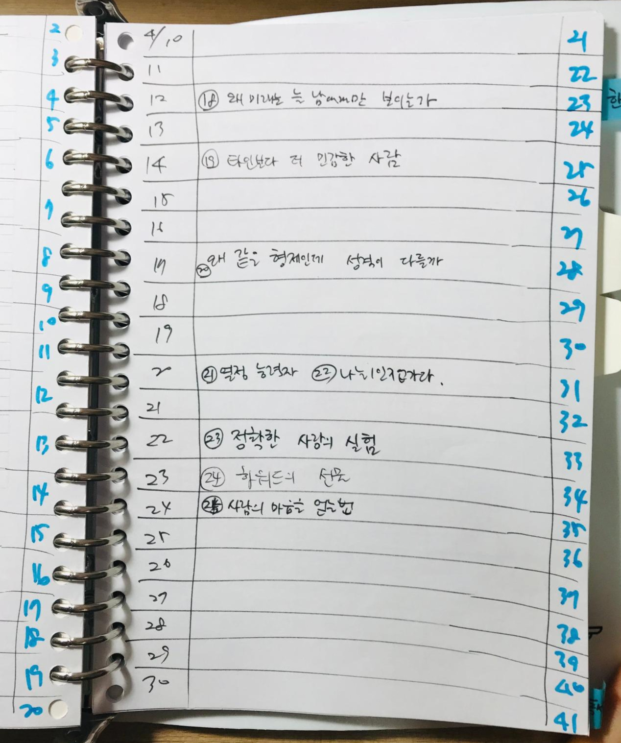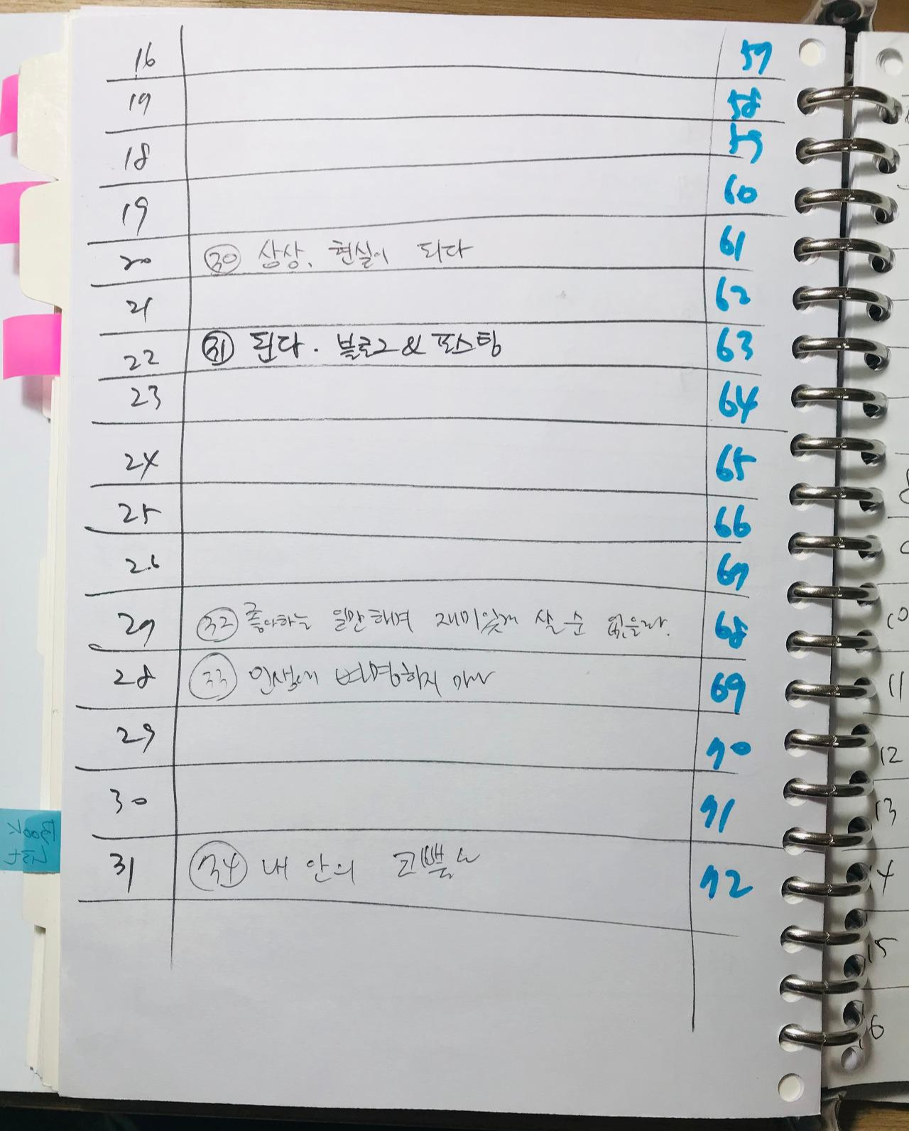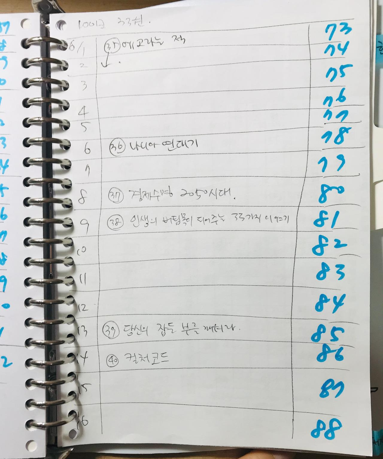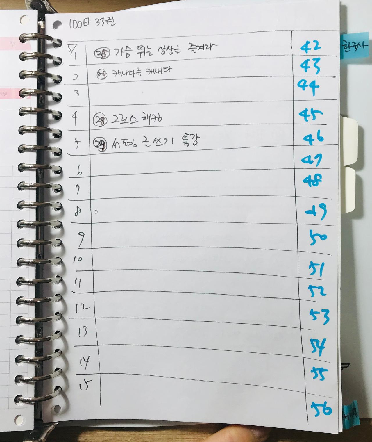 아래의 사진들은 100일 33권 프로젝트를 완료하기 위해 만든 표이다. 왼쪽의 숫자는 날짜이고 오른쪽 파란색으로 쓴 숫자는 일수(1일-100일)이다.