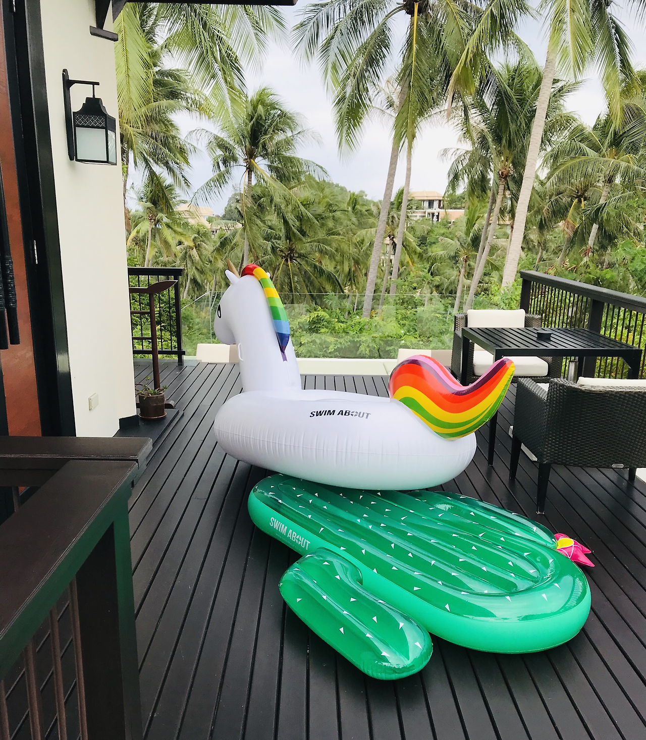 그렇지만! 사실 마냥 잠만 자고 뒹굴거린 건 아니다! ㅎㅎ 어린 시절 가난해서 해보지 못했던 것들, 나이 들어서는 유치 해 보여하지 못했던 것들을 마음껏 해보기로 했다. 이런 선택을 애교로 봐주는 남편 덕분에 나는 큰맘 먹고 거대한 튜브를 2개나 구입했다. 호텔 로비에 요청해 빵빵하게 공기를 채운 유니콘과 선인장 튜브를 물 위에 띄우고 우리 부부는 신나게 놀았다.