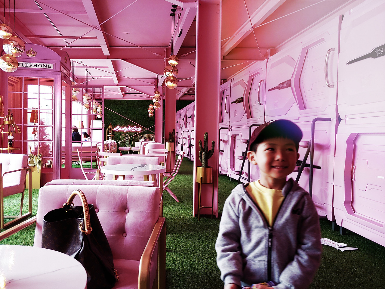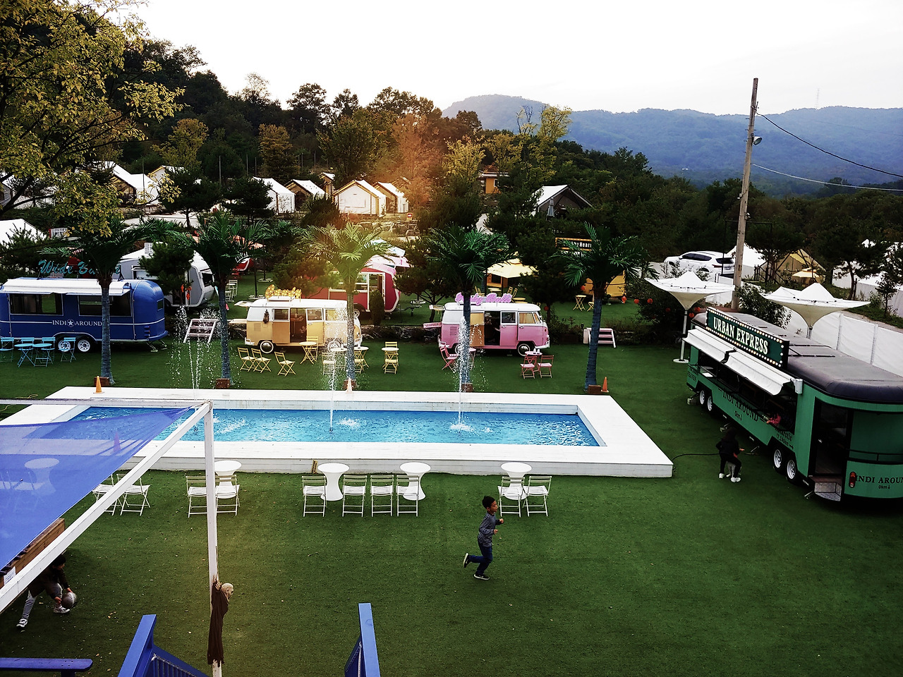 공중전화 부스를 열고 밖으로 나갔더니, 와아! 이런 데가 있었군요. 넓은 잔디밭, 가운데 분수가 있고 주변에 빈티지 버스, 트레일러, 야자수, 파라솔, 테이블과 의자, 인디언 텐트 등이 있습니다. 그 풍경이 아주 근사합니다. 청량한 미국 인디 음악이 울려 퍼집니다. 넓은 공간이지만 곳곳에 스피커를 두어 어디를 가든 비슷한 볼륨으로 들립니다. 여기저기서 사람들이 자유롭게 음료를 마십니다. 아이들이 뜁니다. 고장 난 버스와 트레일러를 개조해 조성한 작은 동네처럼 보이기도 합니다. 건전한 히피들이 마약 대신 봉사활동을 하며 모여 사는, 맥주와 직접 만든 음식을 나누고 춤추며 노래하는 그런 동네, 같았습니다.