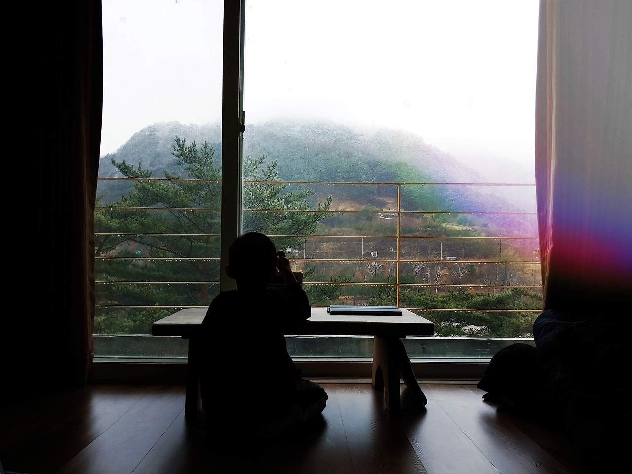 ‘뛰뛰침대’가 있는 방이었다. 리조트 홈페이지에서 본 사진보다는 조금 더 오래돼 보였다. 이제 초등학교에 입학하는 아이의 반응은 의외로 차분했다. 침대를 두어 번 오르락내리락하고, 매트리스 위에서 서너 번 뛰어보고는 흥미를 잃은 듯했다. 리모컨을 누르면 소리도 나고 불도 들어오고 하는데! 시끄럽다고 끄라고 했다. 아이의 관심은 창밖에 있었다. 아내와 나도 그러했으므로 기뻤다.