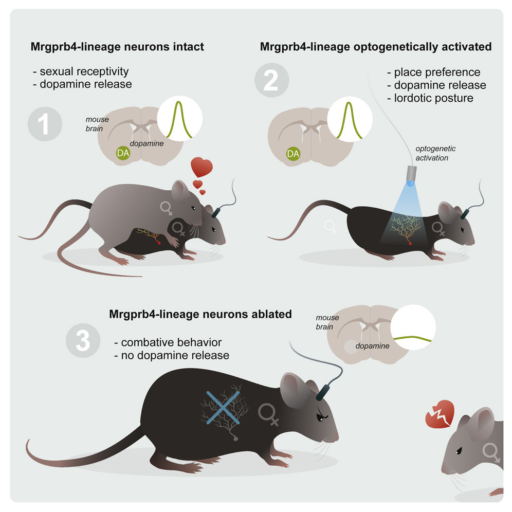 이 연구에서 사부어(Ishmail Abdus-Saboor) 연구팀의 엘리아스(Leah J. Elias)는 타자의 접촉(social touch)을 피부에서 받아들여 뇌의 보상 시스템을 작동시키는 뉴런을 특정했다. 그것은 털이 있는 피부 (hairy skin) 쪽으로 가지를 뻗은 Mrgprb4 뉴런(Mrgprb4라는 유전자를 발현하는 감각 신경세포)이다. 이 뉴런은 가벼운 어루만짐에 반응한다고 알려져 있었는데, 이번 연구로 교미 도중 NAc(nucleus accumbens, 측좌핵)에서 도파민이 분비되는 데 필요할 뿐만 아니라 암컷이 수컷의 구애를 받아들이는 데에도 특정 역할을 한다는 것을 알게 되었다.