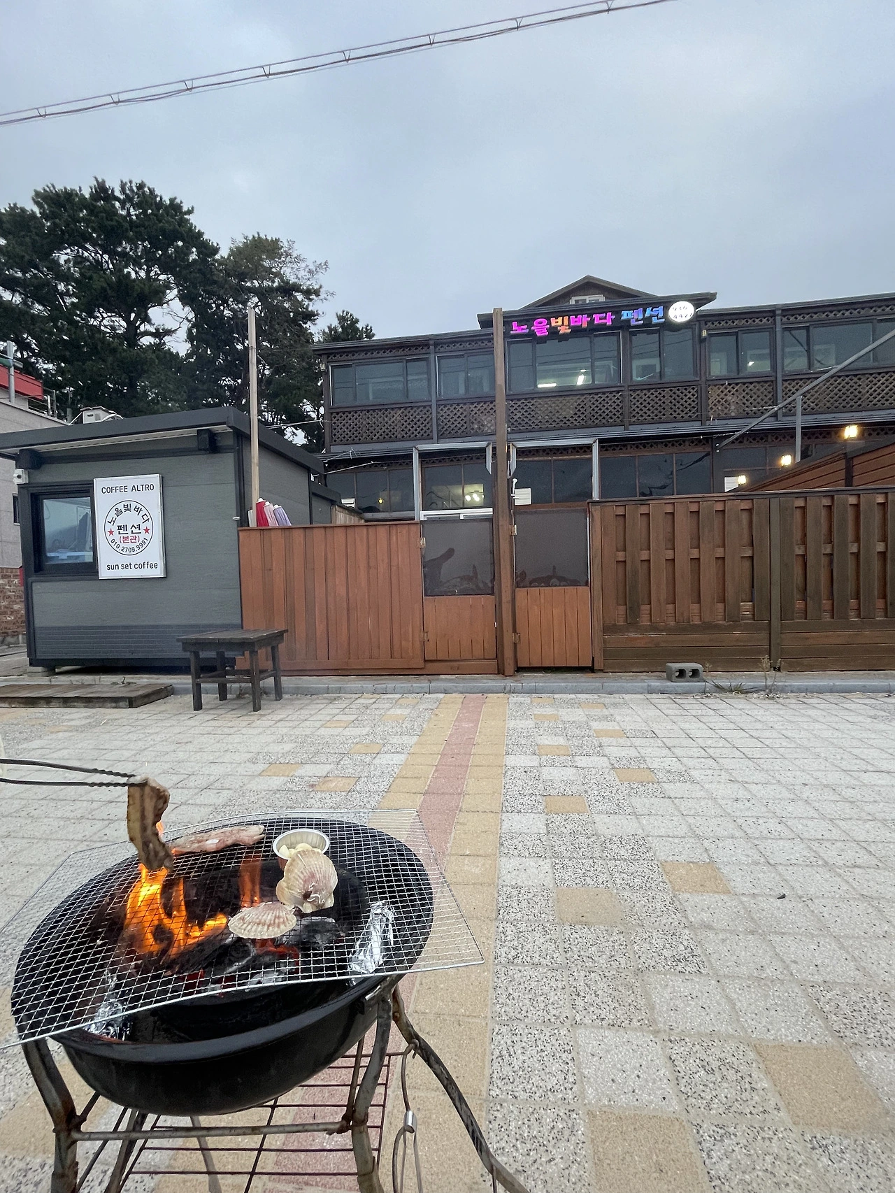 바다 앞 펜션을 예약해서, 야외 바비큐를 할 예정이다.