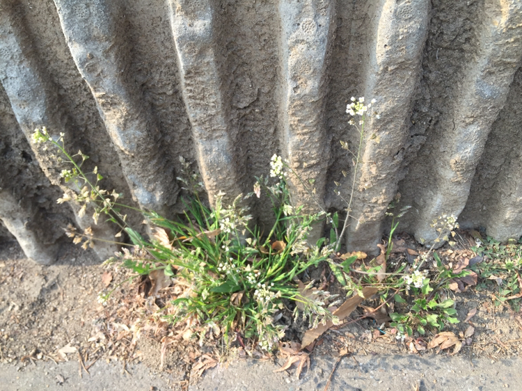 조그만 꽃무더기 덕분에 회색 벽에 빛이 난다.