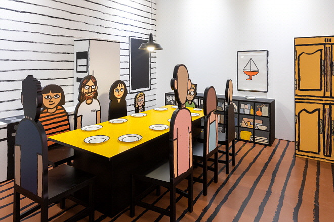 줄리앙은 이번 전시를 기획하며 서프라이즈 공간을 만들었는데, 가족의 모습과 집의 공간으로 꾸며진 곳을 준비한다. 줄리앙은 벽에 선을 하나씩 그려 넣으며 이 공간을 만들었다. 테이블이 노란색인데, 줄리앙은 레스콘이라는 프랑스 마을에서 태어났고 그곳에서 노란색 테이블을 사용했다고 한다.