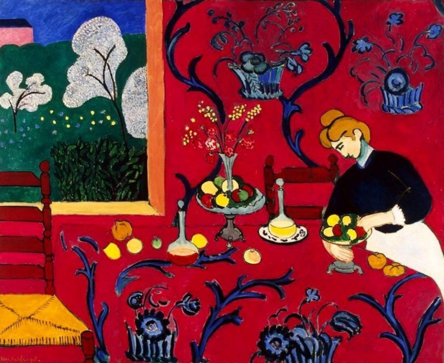 앙리 마티스는 이러한 원초적이며 정열적인 레드 컬러를 활용했다. 앙리 마티스의 작품들은 원색을 활용하여 역동적이고 살아 움직이는 듯하다. 그는 색을 통해 감정과 심상을 표현했는데, <붉은 방>에서는 작품 전체를 레드로 구성하여 분위기를 압도했다. 창문에서는 햇빛이 방안 곳곳을 비추며 밝고 따뜻한 분위기가 느껴진다. 붉은색과 대비되게 창밖은 푸른색과 초록색으로 그려져 보색을 이루어 리드미컬하게 표현했다.