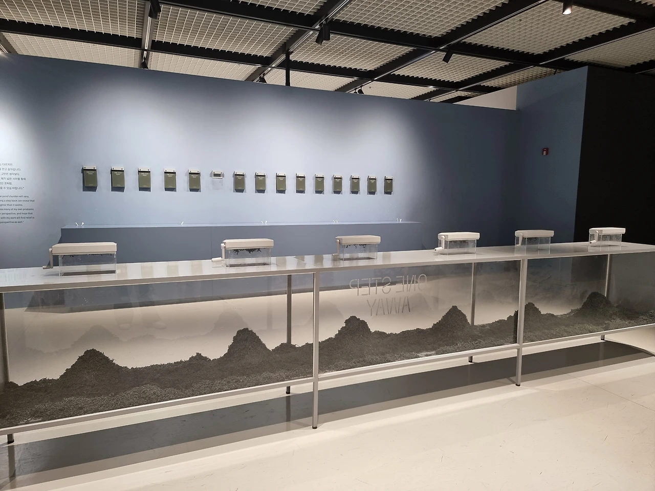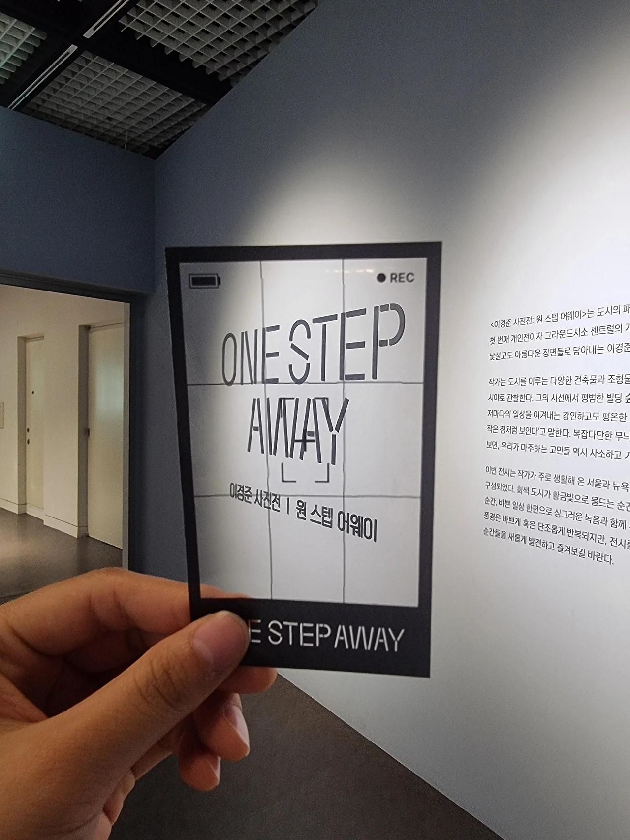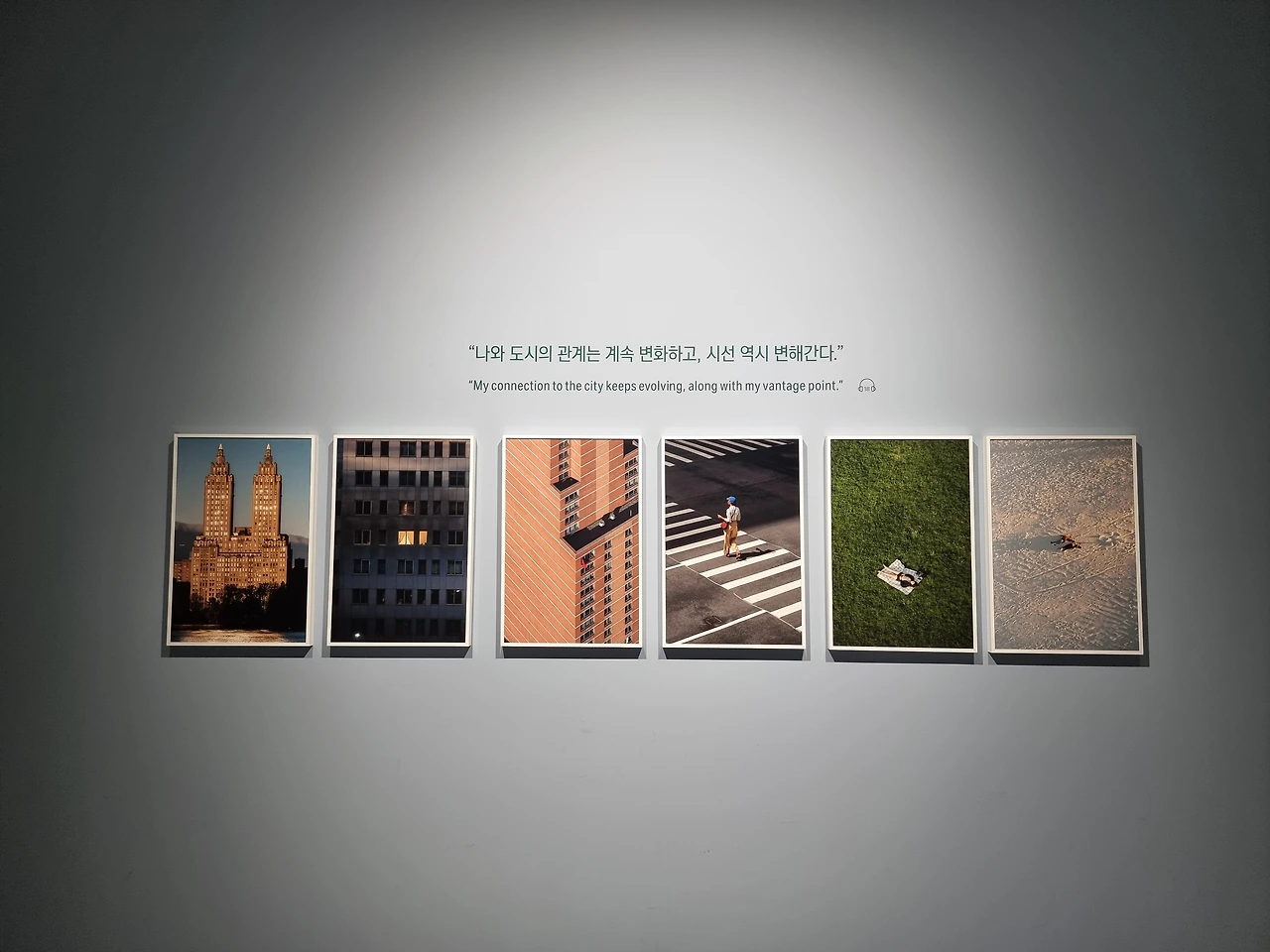 6. "거대한 빌딩 숲, 서로를 스쳐가는 수많은 사람들 그 속애서 때로는 가로막히기도, 길을 잃기도 히면 가졌던 고민.. 이경준 작가의 하이앵글 프레임 속애서는 모두 작은 점으로 기록됩니다. ... 시야는 넓게, 고민은 가볍게, 멀리봐야 비로서 보이는 것들 전시장을 나서기 전에 아주 사소한 고민 하나라도 이곳에 두고 가세요."