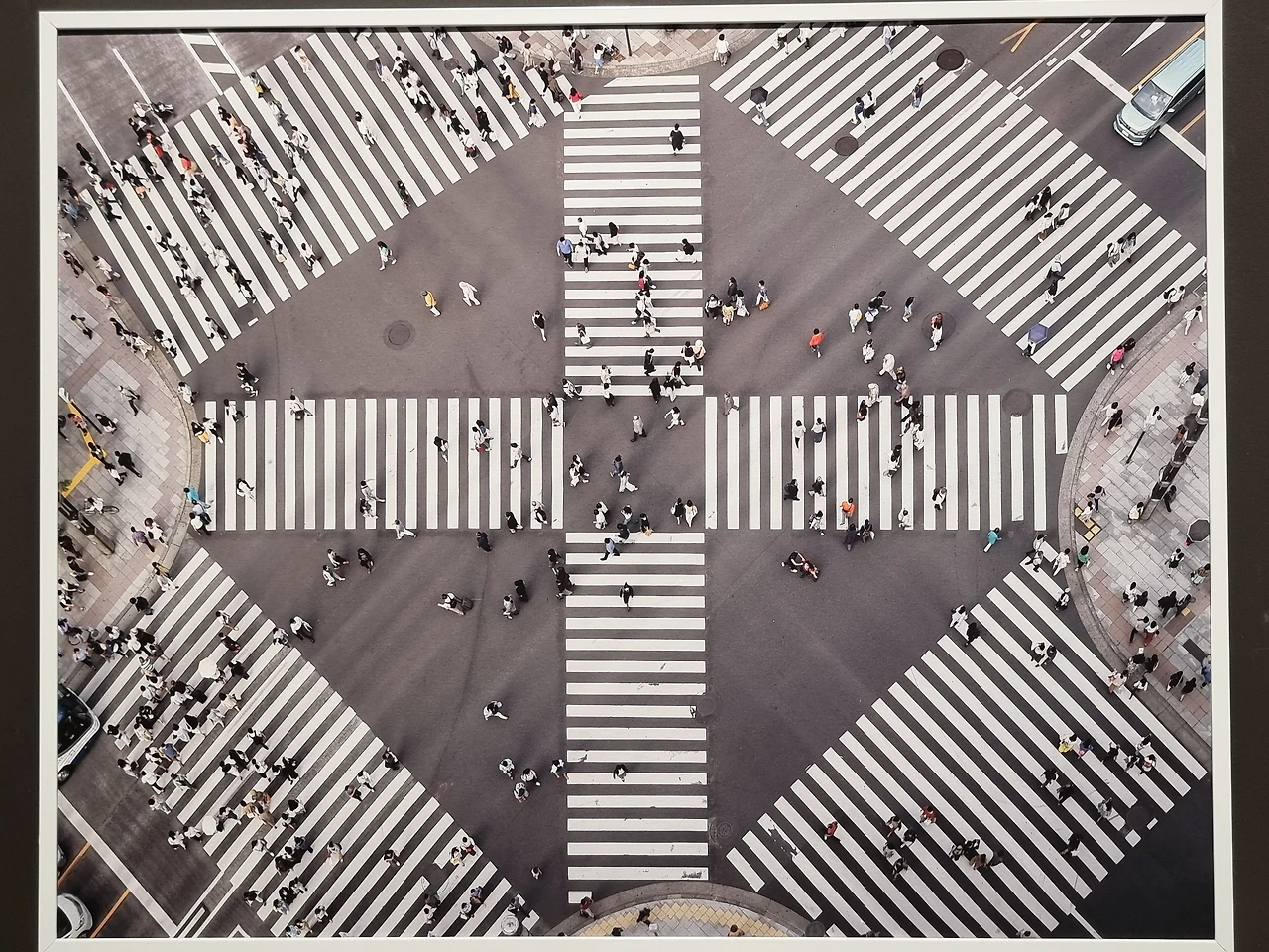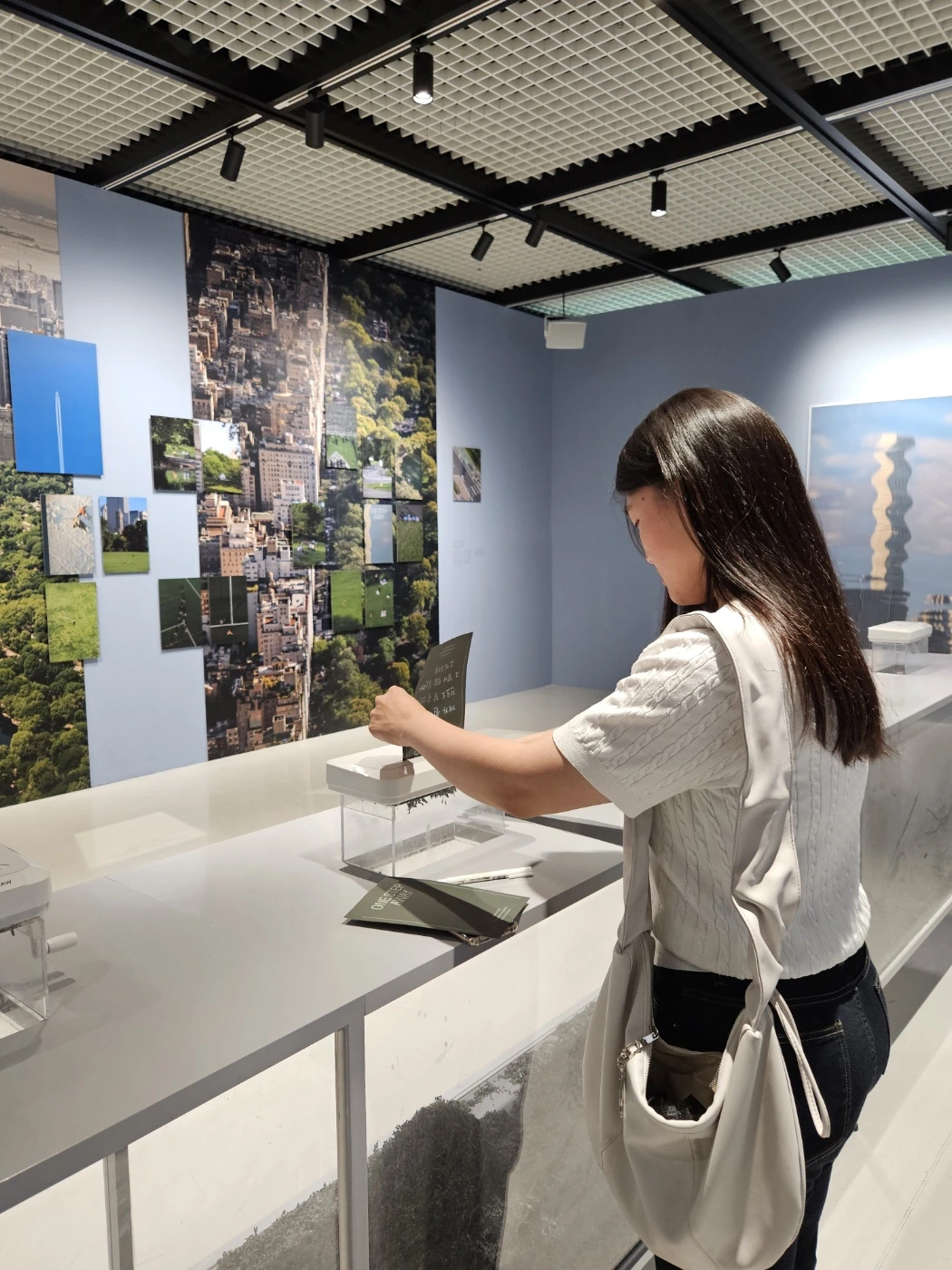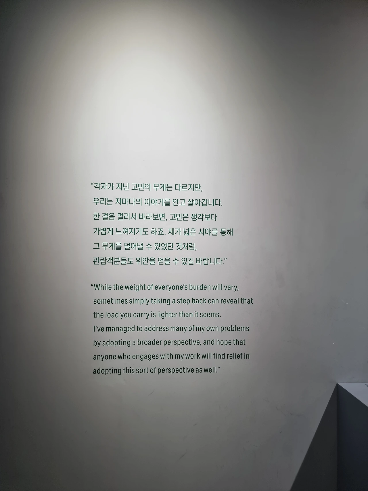 6. "거대한 빌딩 숲, 서로를 스쳐가는 수많은 사람들 그 속애서 때로는 가로막히기도, 길을 잃기도 히면 가졌던 고민.. 이경준 작가의 하이앵글 프레임 속애서는 모두 작은 점으로 기록됩니다. ... 시야는 넓게, 고민은 가볍게, 멀리봐야 비로서 보이는 것들 전시장을 나서기 전에 아주 사소한 고민 하나라도 이곳에 두고 가세요."