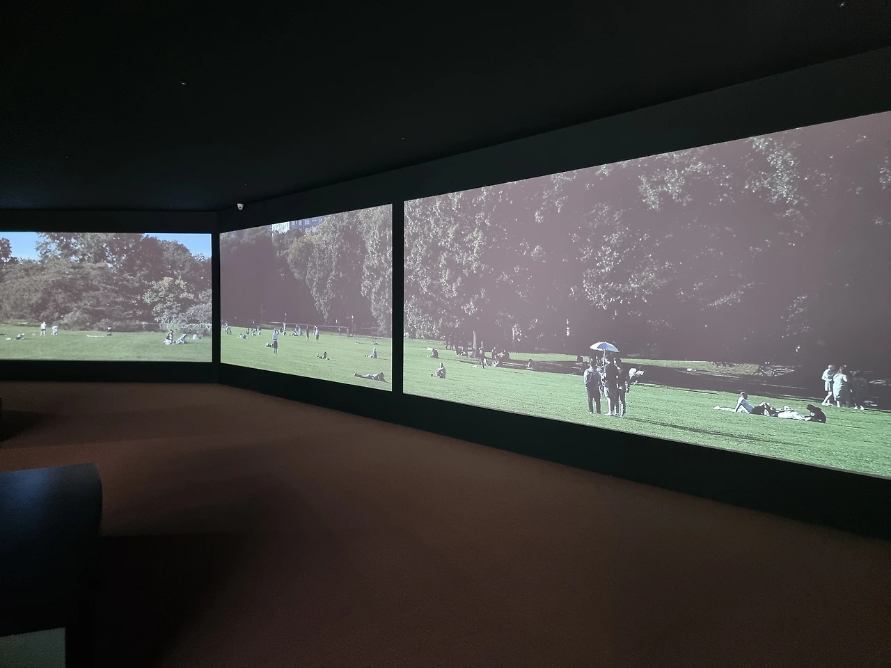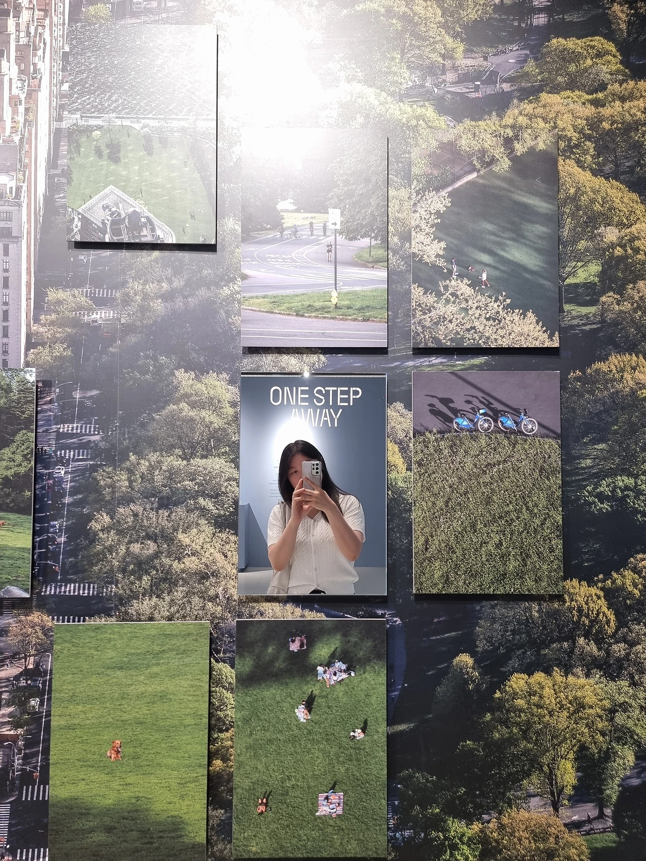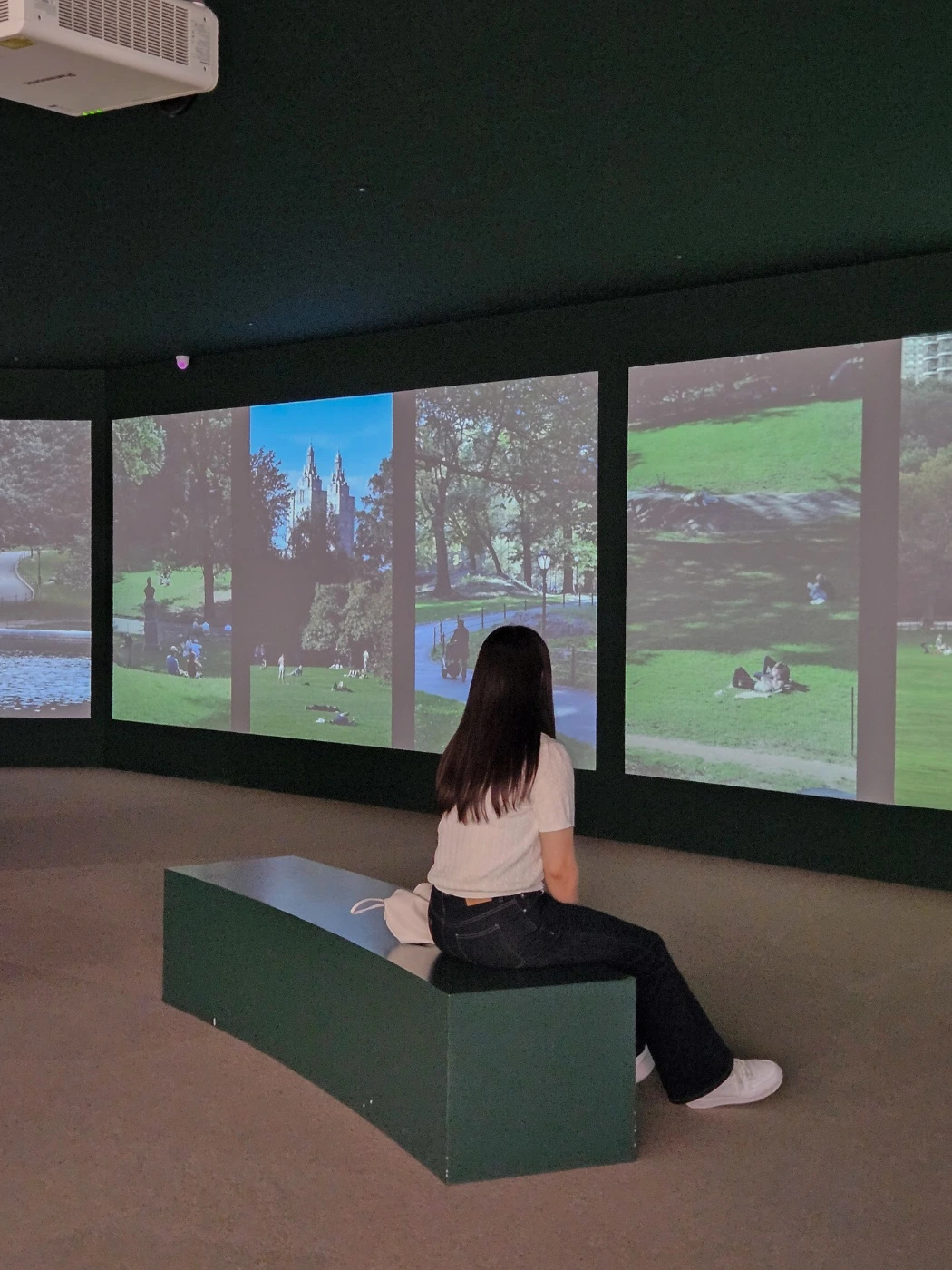 5. 공간 전체를 녹색으로 페이팅하고, 중앙에 동그랗게 사진을 전시하고, 한쪽 벽면 전체엔 공원에서 쉬고 있는 영상을 스크린으로 구성해 내가 마치 센트럴파크에 한가운데 있는 듯한 느낌을 받았다.