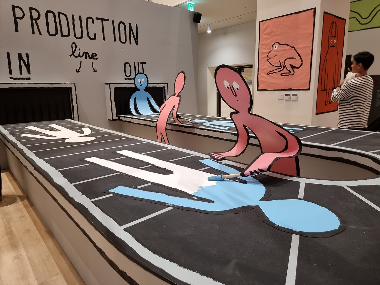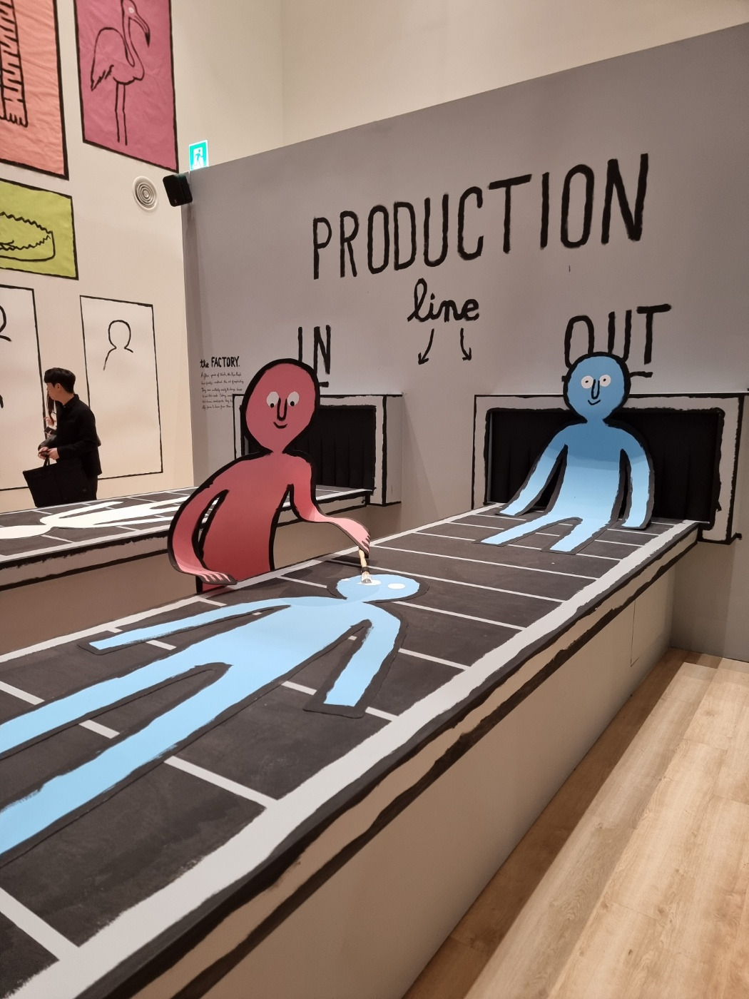 전시를 들어서면 커다란 종이인간과 조형물, 벽에 가득한 작품에 놀라움과 탄성이 나온다. 이곳은 페이퍼 팩토리로 종이인간들이 만들어지고 그들이 일하는 작업장을 볼 수 있다. 컨베이어 벨트가 있고 그 벨트 위에 페이퍼피플들이 생산된다. 이제 막 그려지기 시작한 페이퍼피플들이 자신이 가위질 되기를 기다리고 컨베이어벨트 앞 작업자는 색을 칠하고 눈을 그리고 있다. 바로 위쪽 공간에서는 거대한 페이퍼피플을 레일에 매달아 말리고 있는 모습을 볼 수 있다.