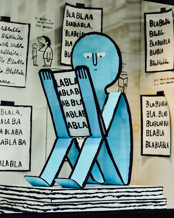 장줄리앙의 <그러면, 거기> 전시를 보았다면 한 번쯤은 종이인간을 마주쳤을 것이다. 페이퍼피플은 장줄리앙의 일러스트에서 태어난 조형물이다. 페이퍼피플 세계관이 연결된다는 점이 이번 전시의 매력포인트인데, 파리의 르 봉 마르쉐 백화점에서 페이퍼피플의 탄생과 진화, 그리고 더 큰 세상을 향한 열망을 보여준다. 장 줄리앙의 거침없는 붓터치와 따뜻한 색채로 튀어나온 페이퍼피플은 유리창 안에서 책을 읽고 사람들을 관찰하며 자신들만의 세상을 꿈꾼다.