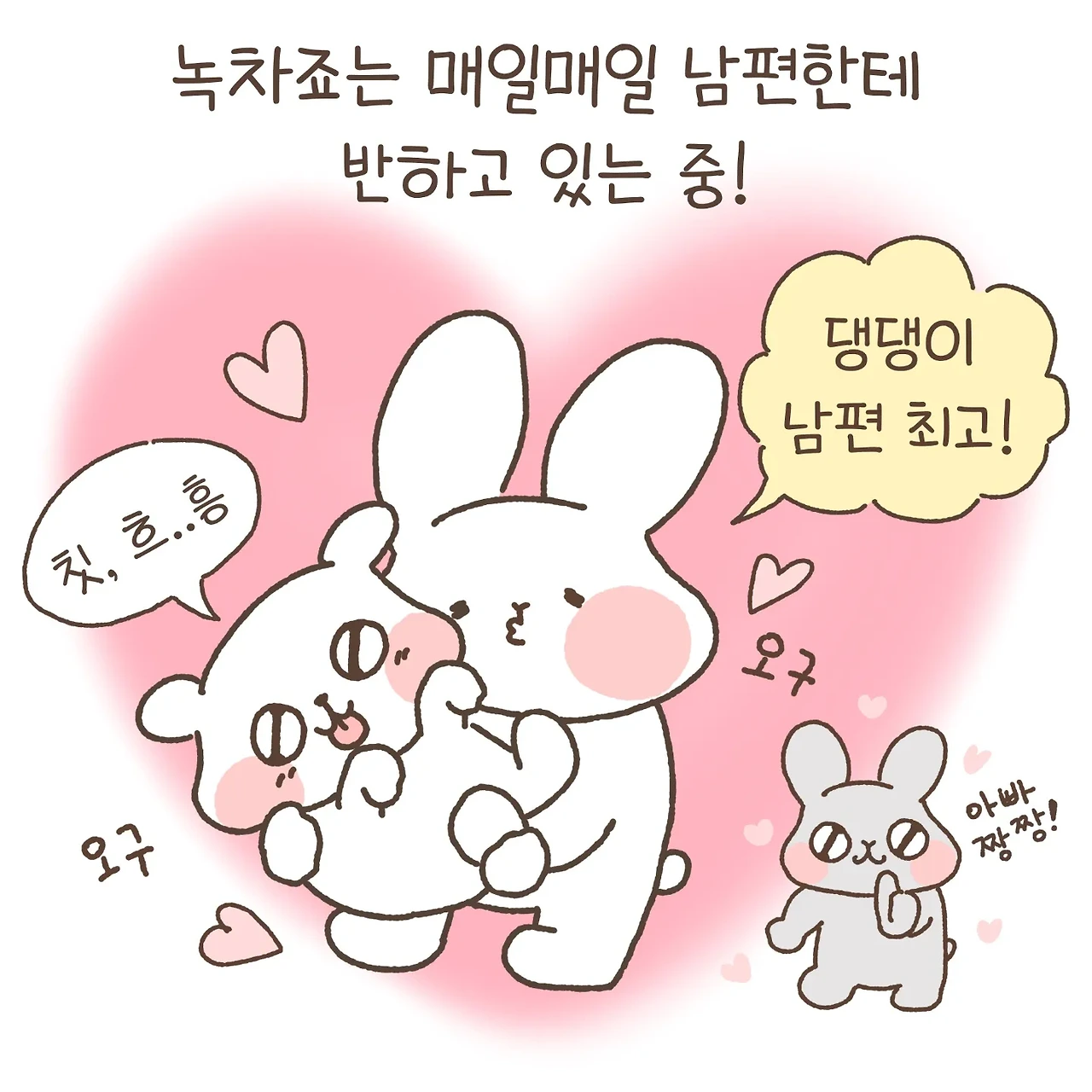 하루의 따뜻함 녹차죠입니다 우당탕탕 신혼 일상 만화에요! 귀여운 토끼와 미니메추리의 반려 집사랍니다~ 주 2회 이상 연재합니다