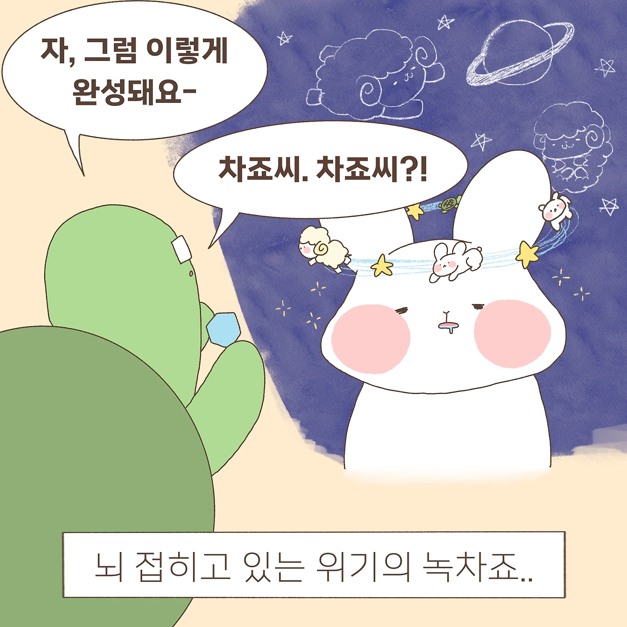 하루의 따뜻함 녹차죠입니다 우당탕탕 신혼 일상 만화에요! 귀여운 토끼와 미니메추리의 반려 집사랍니다~ 주 2회 이상 연재합니다