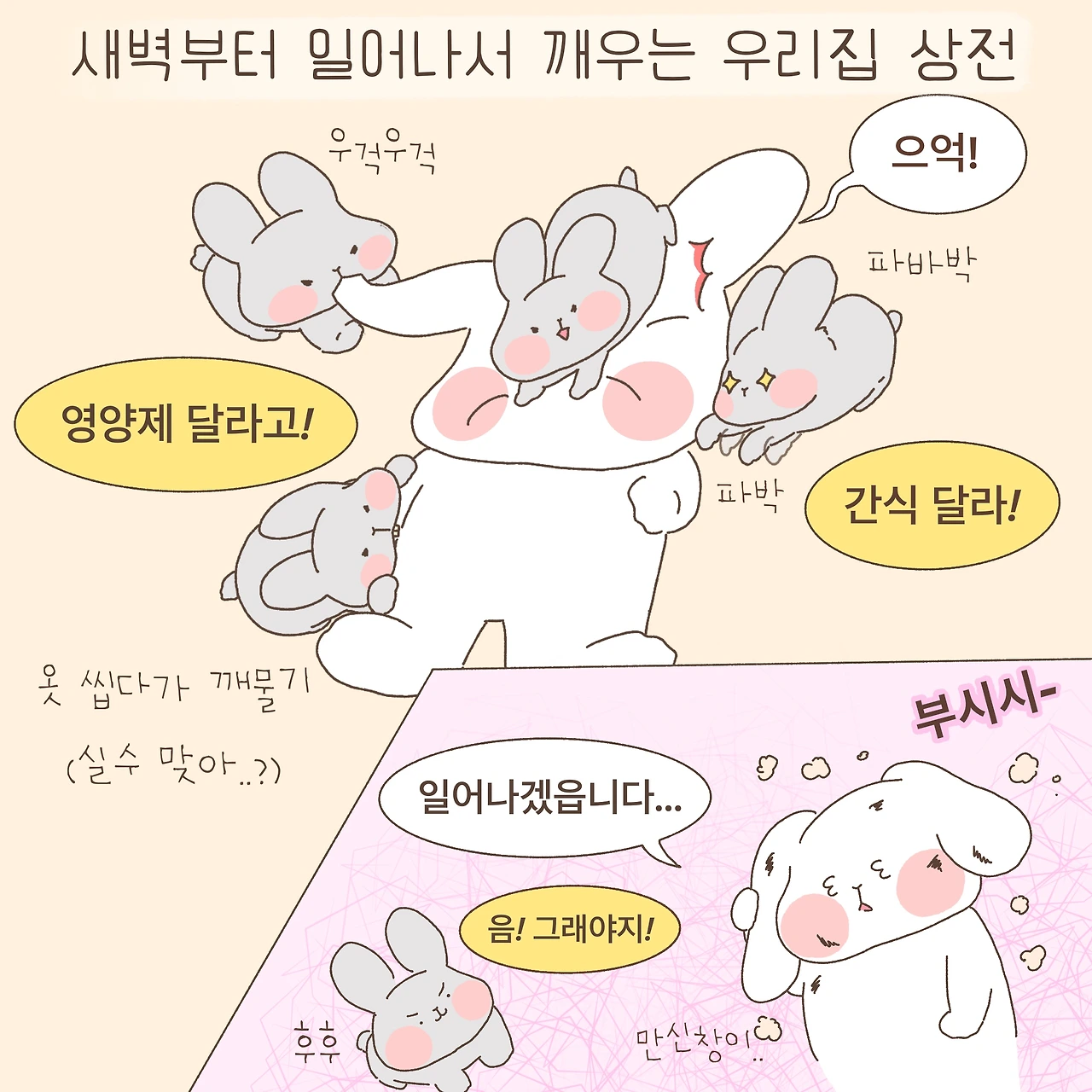 이후엔 한동안 안 깨우다가 요즘엔 다시 파바박 하면서 깨우고 있어서 아침마다 강제 기상하고 있답니다.