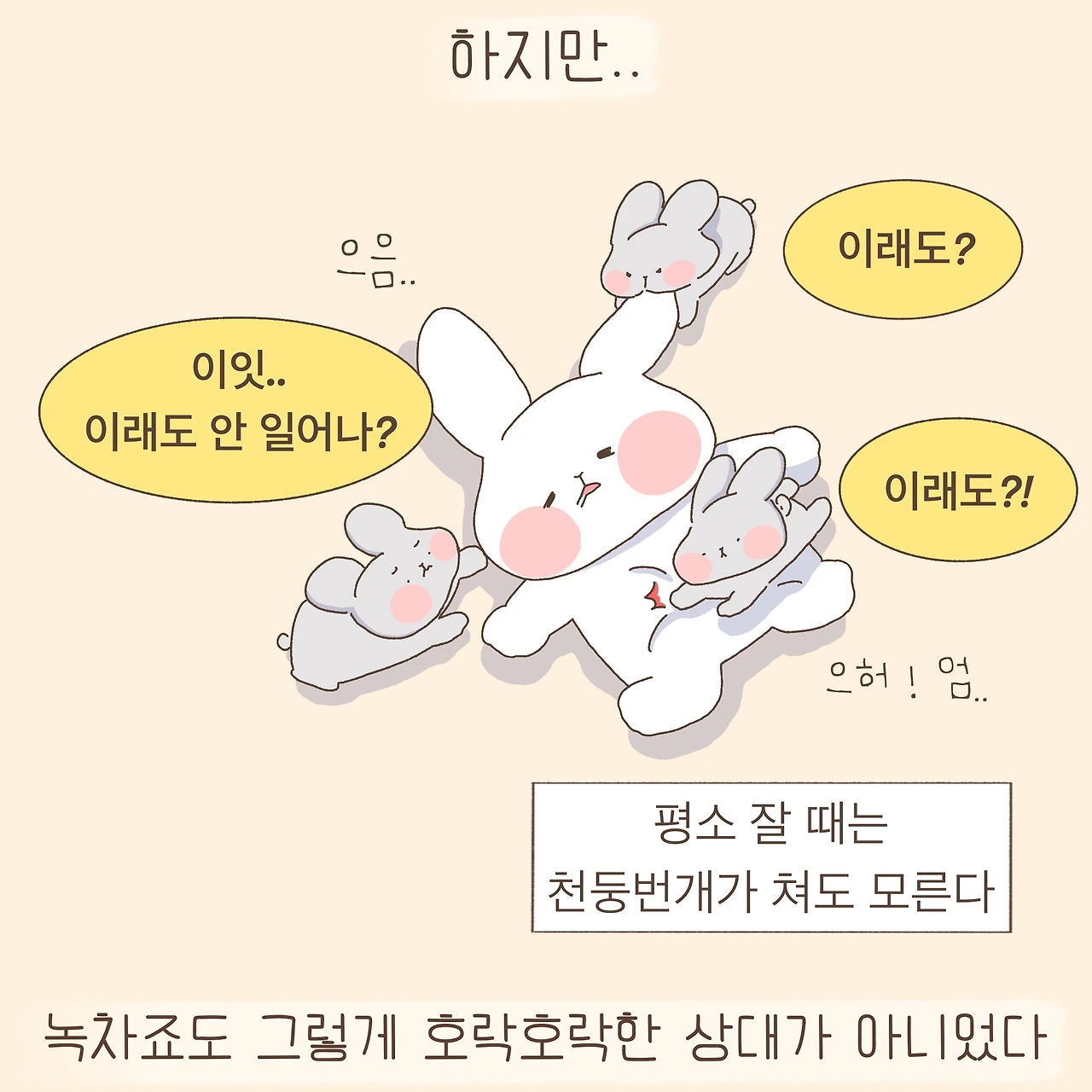 하루의 따뜻함 녹차죠입니다 우당탕탕 신혼 일상 만화에요! 귀여운 토끼와 미니메추리의 반려 집사랍니다~ 주 2회 이상 연재합니다