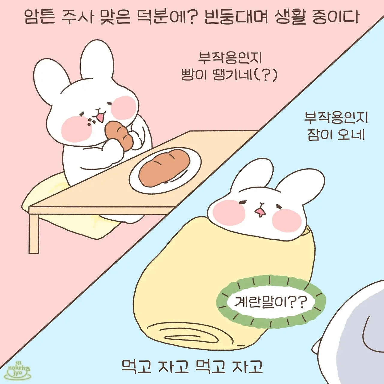 하루의 따뜻함 녹차죠입니다 우당탕탕 신혼 일상 만화에요! 귀여운 토끼와 미니메추리의 반려 집사랍니다~ 주 2회 이상 연재합니다