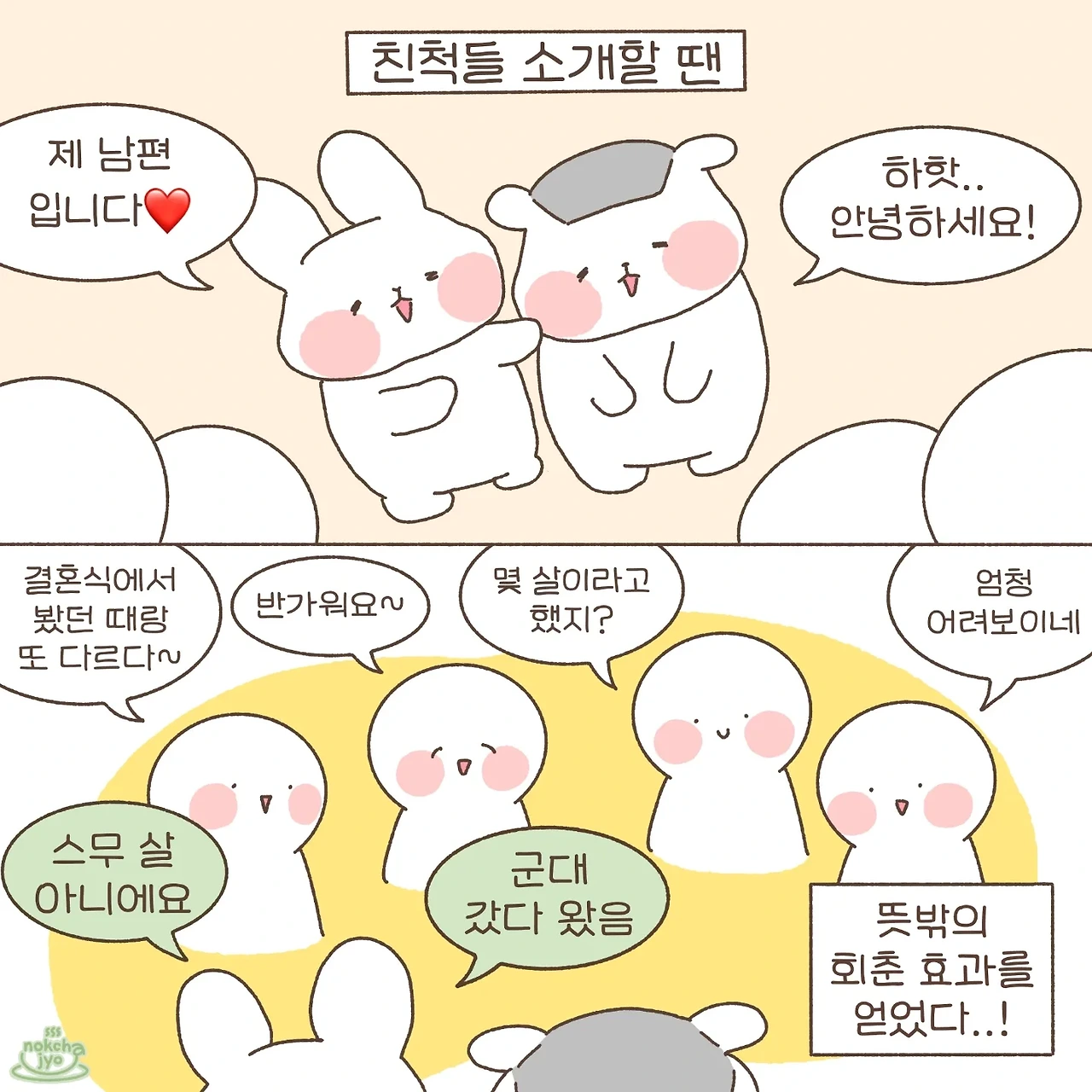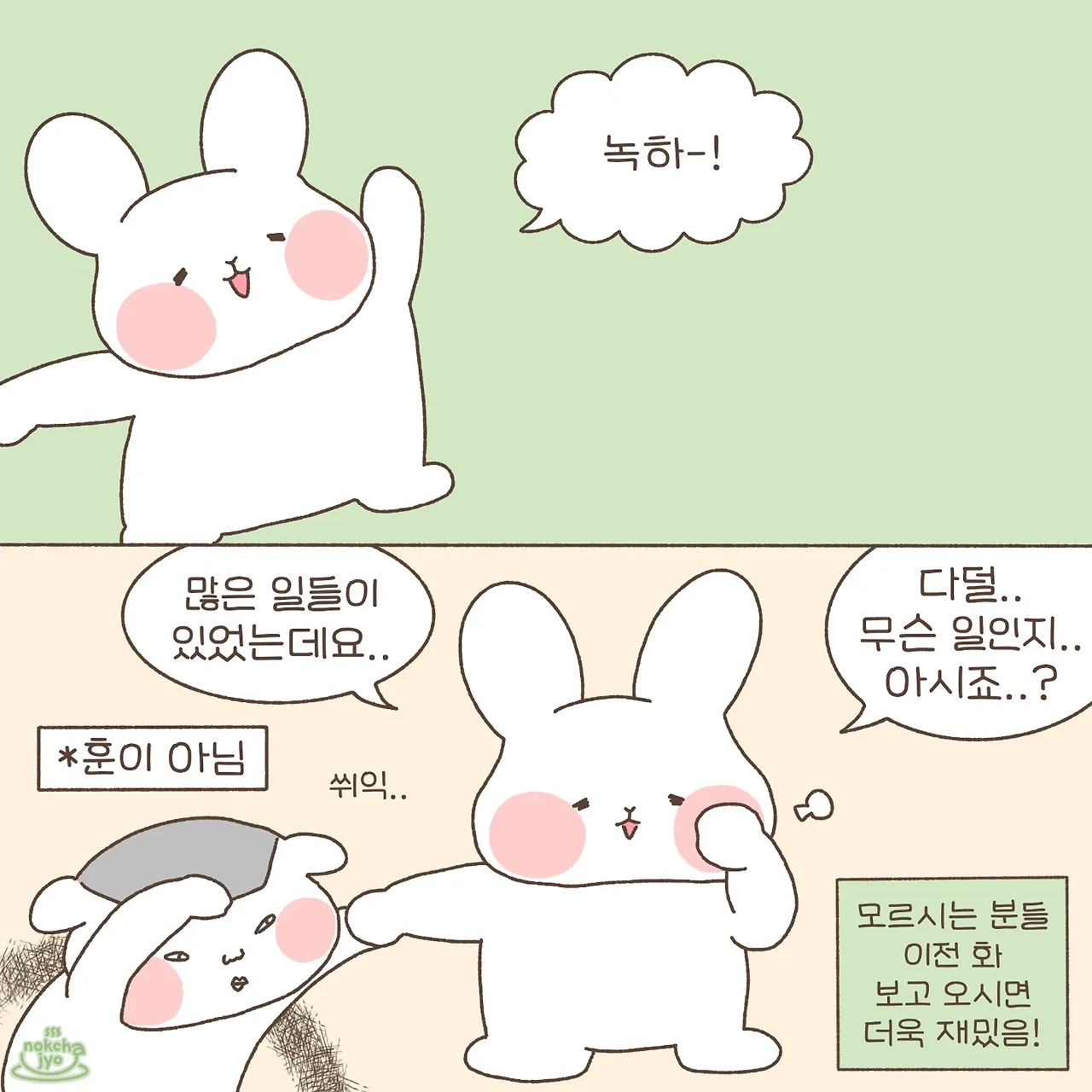 하루의 따뜻함 녹차죠입니다 우당탕탕 신혼 일상 만화에요! 귀여운 토끼와 미니메추리의 반려 집사랍니다~ 주 2회 이상 연재합니다