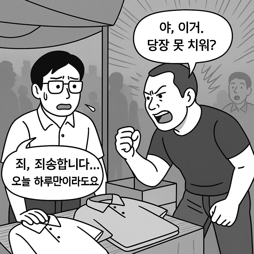 “보소, 젊은 아재. 신 부장 말만 믿고 자리 폈는 모양인데, 저 친구가 저래하는 기 다 이유가 있으니 그쪽이 이해하소. 허술하게 보여도 여기노점에도 규칙과 법이 있소. 당신 발 밑에 금을 잘 보소. 거기가 경계선인데, 당신이 우리 동생 자리를 한참이나 많이 침범해 가지고 자리를 깔았으니 우리 동생이 더 열받은 것 아니요?”