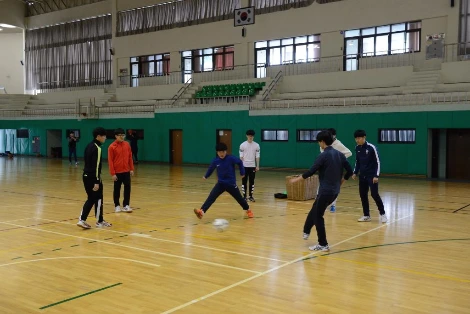 아침에 비가 온 관계로 축구는 풋살장 대신 체육관에서 진행이 되었습니다.