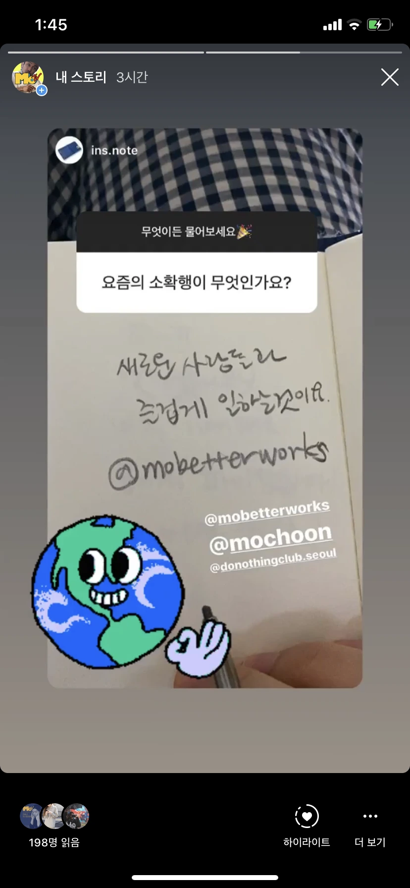 - 진짜 바쁘고 정신없는 한 주였지만 소호. 모춘. 대오. 한택 모두 같은 목표를 가지고 응원하고 격려했기 때문에 이 번 한 주를 잘 마무리할 수 있었던 것 같다. 감사합니다 정말.