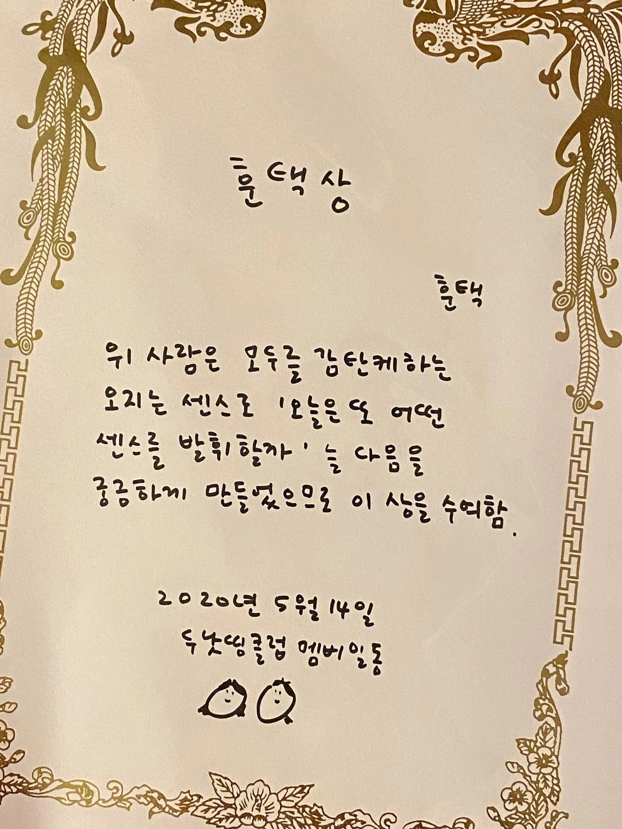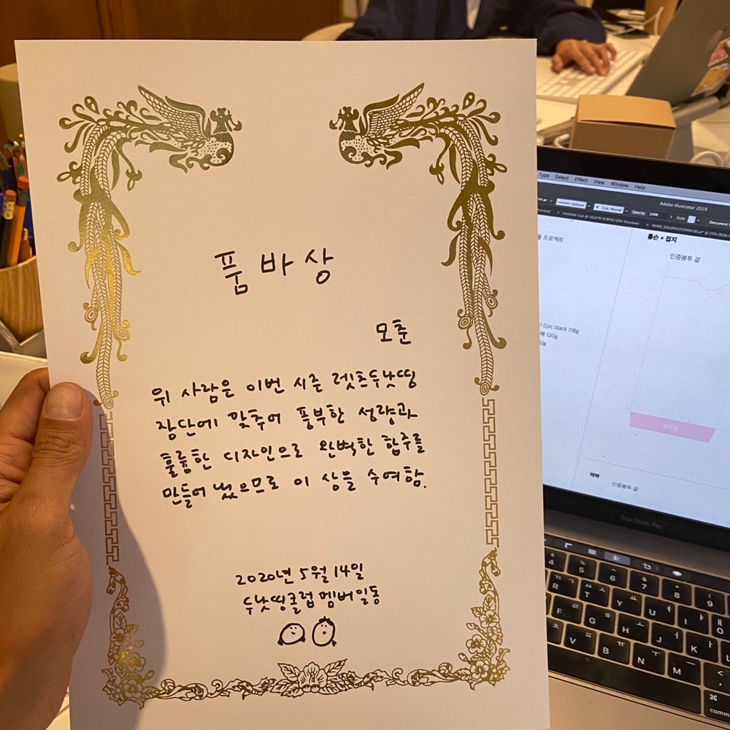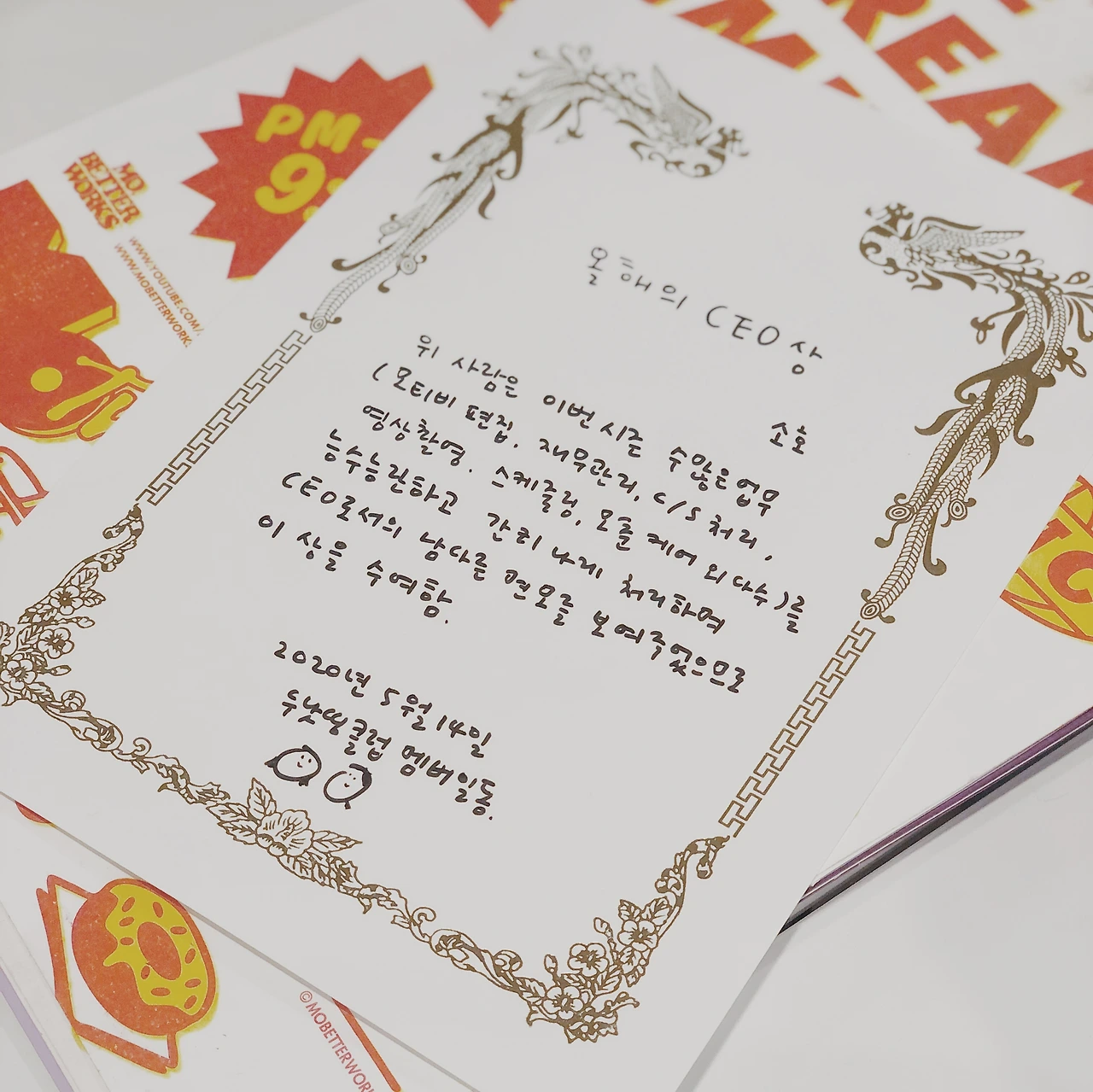 두낫띵클럽에서도 결산 리뷰 자료를 준비했다. 작은 노트에 그동안 프로젝트를 진행하며 느끼고 궁금했던 부분들을 적은 문답 노트 형식의 회고록과 각 멤버들의 노고를 칭찬하고 축하하는 상장. 가볍고 웃긴 질문부터 고민하게 만드는 질문까지. 스스로 조용히 지난 시간을 되돌아본 후 각자의 감상을 나누는 과정을 통해 웃기도 하고 하나의 상황에 대한 서로의 다른 생각도 들어보는 시간이었다. 내가 겪어본 결산 중 가장 즐겁고 가장 구체적인 결산이었다.