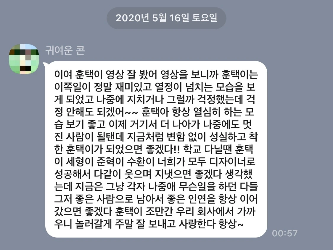 드디어! 모티비에서 나의 유튜브 채널을 런칭했다. 제목은 <훈택의 신입디자이너 생존기>이다. 너무 후련하다. 업로드하고 나니 뭔가 자신감도 생기고 더 적극적으로 올리고 싶은 마음도 솟구친다. 팀원들에게 무언가를 공유하고 피드백받고 수정하고 완성해가는 일은 언제나 즐겁고 보람된 일 같다. 그리고 팀원 모두 전부 자신의 일처럼 기뻐해 주셔서 너무너무 감사하다. 또 나의 유튜브를 시청해준 친구, 형, 누나들에게서 온 축하 메시지도 너무너무 감사하다.