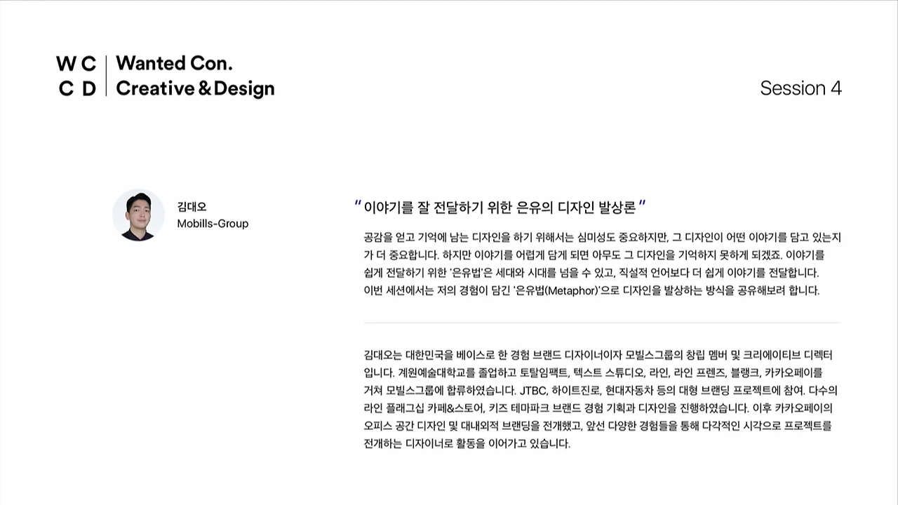 지난 금요일. 대오가 원티드에서 주최한 WCCD : Creative & Design Conference에 연사로 발표했다. 모빌스그룹 크리에이티브 디렉터로서 공식적/대외적으로 진행한 첫 번째 발표여서 남다른 기분이 느껴졌다.