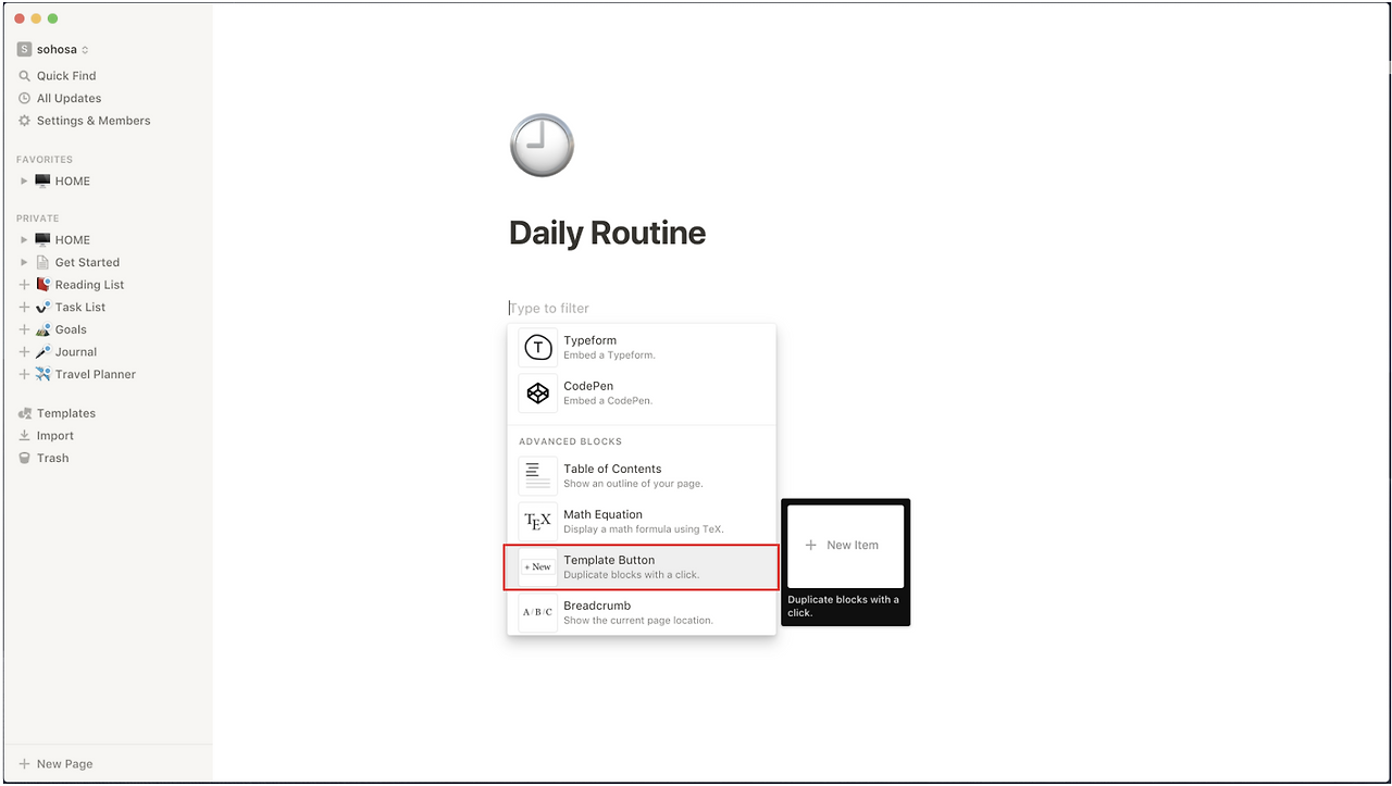 빈 페이지에서 '/' 타이핑 > 'Template Button' 클릭