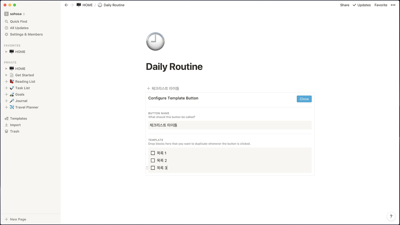 매일 혹은 정기적으로 같은 리스트를 체크해야 할 일이 있다면 아주 유용한 노션의 'Template Button' 기능을 공유한다. 한 번 리스트를 만들어 두면, 한 번의 클릭 만으로 동일한 리스트를 불러올 수 있기 때문에 매번 체크를 해제해서 리셋할 필요 없이 편하게 사용 가능하다. 습관을 만들기 위해 매일 체크할 것이 필요한 사람에게 추천한다.